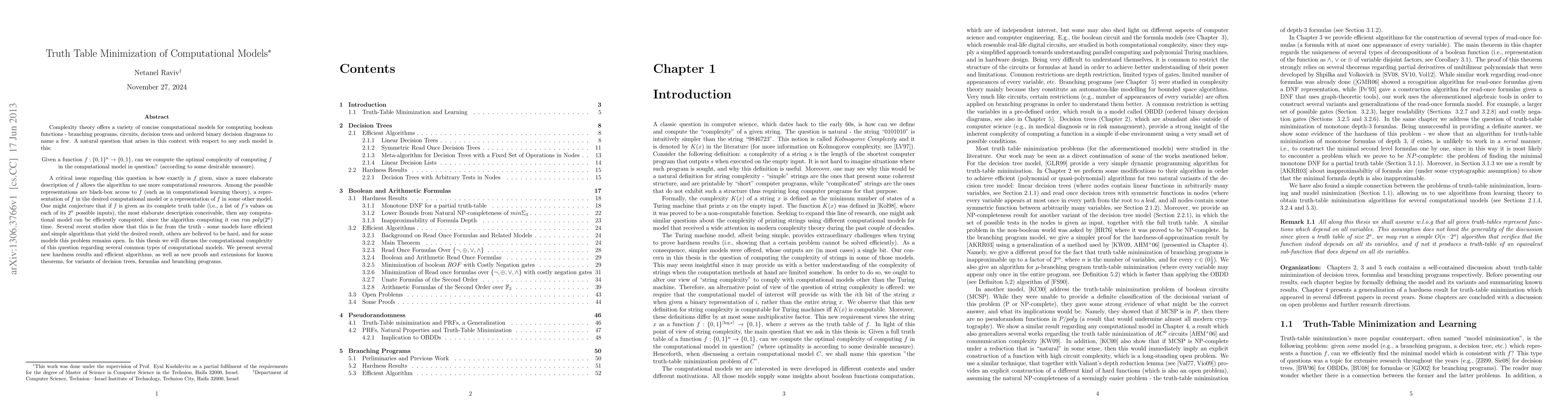 Complexity theory offers a variety of concise computational models for computing boolean functions - branching programs, circuits, decision trees and ordered binary decision diagrams to name a few. A natural question that arises in this context with respect to any such model is this: Given a function f:{0,1}^n \to {0,1}, can we compute the optimal complexity of computing f in the computational model in question? (according to some desirable measure). A critical issue regarding this question is how exactly is f given, since a more elaborate description of f allows the algorithm to use more computational resources. Among the possible representations are black-box access to f (such as in computational learning theory), a representation of f in the desired computational model or a representation of f in some other model. One might conjecture that if f is given as its complete truth table (i.e., a list of f's values on each of its 2^n possible inputs), the most elaborate description conceivable, then any computational model can be efficiently computed, since the algorithm computing it can run poly(2^n) time. Several recent studies show that this is far from the truth - some models have efficient and simple algorithms that yield the desired result, others are believed to be hard, and for some models this problem remains open. In this thesis we will discuss the computational complexity of this question regarding several common types of computational models. We shall present several new hardness results and efficient algorithms, as well as new proofs and extensions for known theorems, for variants of decision trees, formulas and branching programs.