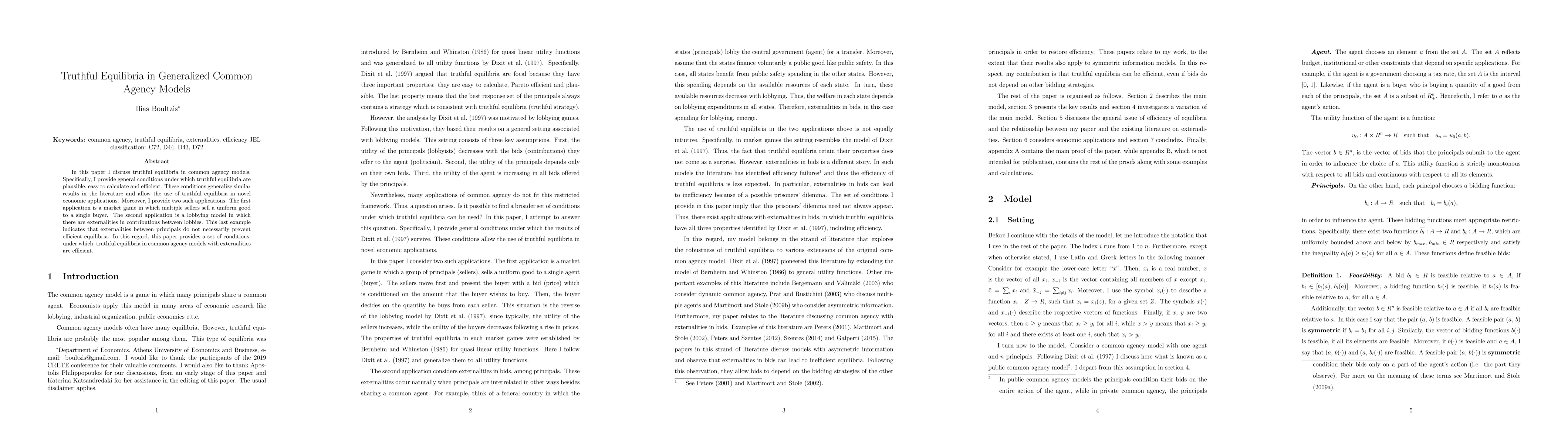 This paper explores truthful equilibria in generalized common agency models, providing conditions for their plausibility, calculation, and efficiency. It demonstrates applications in market games and lobbying models, showing that externalities do not always hinder efficient equilibria.