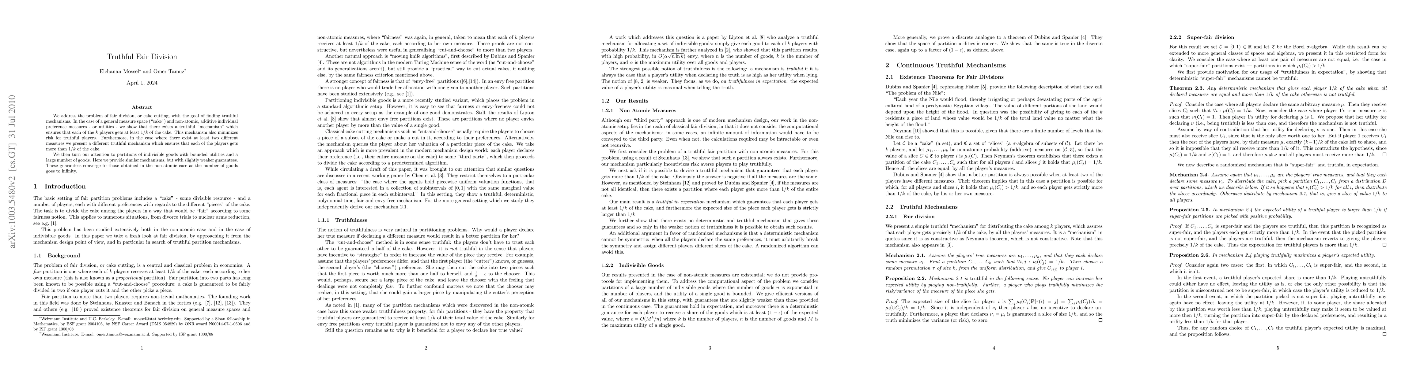 This paper proposes truthful mechanisms for fair division of divisible and indivisible goods among multiple players, ensuring each player receives at least 1/k of the divisible "cake" while minimizing risk. For multiple measures, it provides a mechanism ensuring each player gets more than 1/k. For indivisible goods, it offers similar mechanisms with guarantees that converge to the divisible case as the number of goods increases.