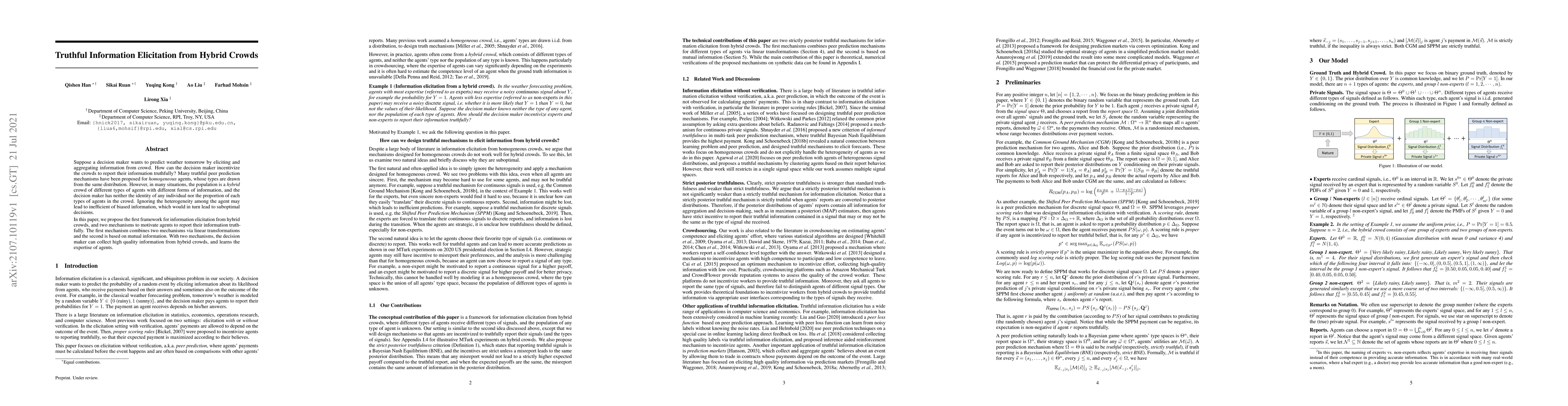 This paper proposes a framework for eliciting truthful information from hybrid crowds, where agents have diverse types and information. It introduces two mechanisms to incentivize truthful reporting, aiming to collect high-quality information and learn agent expertise for better decision-making.