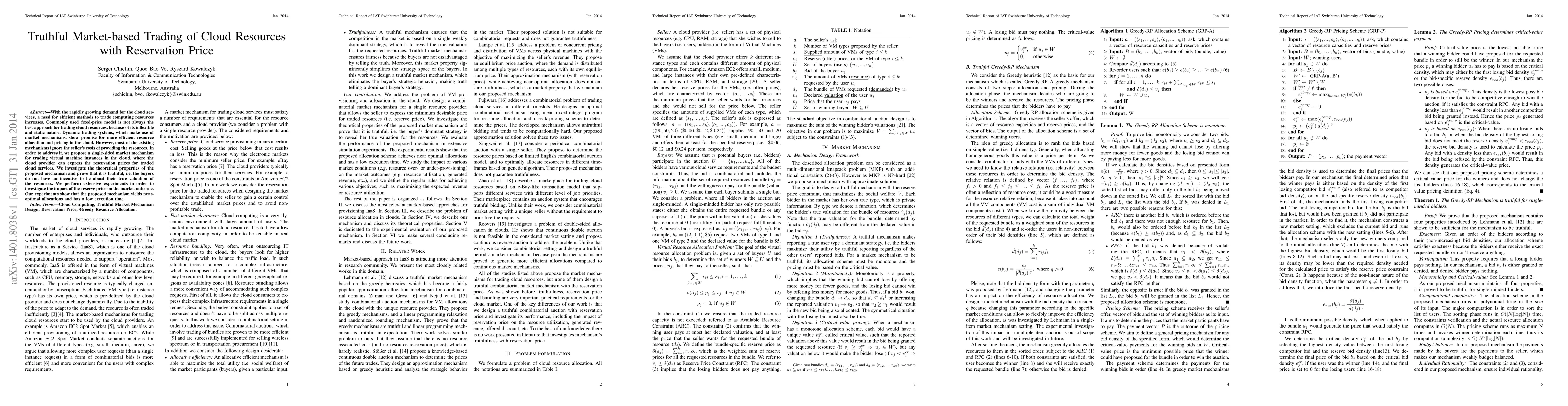 This paper proposes a market-based trading mechanism for cloud resources that incorporates sellers' reservation prices, ensuring truthful bidding and efficient resource allocation. The mechanism is shown to yield near-optimal outcomes and low execution times through theoretical analysis and extensive experiments.