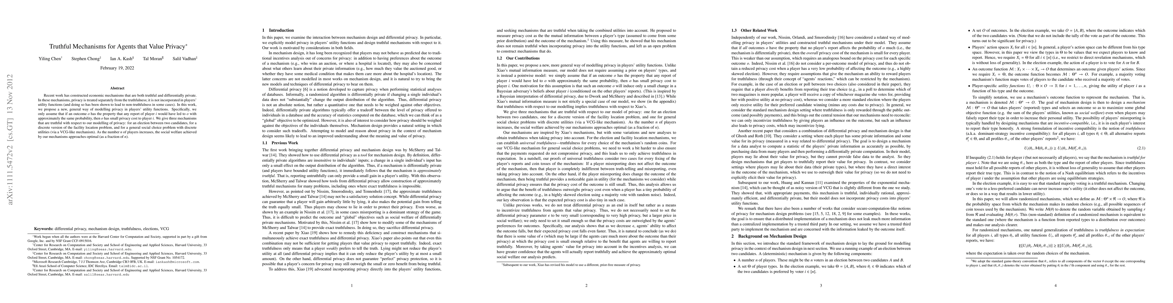 New research proposes a way to model privacy in economic mechanisms, leading to truthful mechanisms for agents that value privacy, with improved social welfare as the number of players increases.