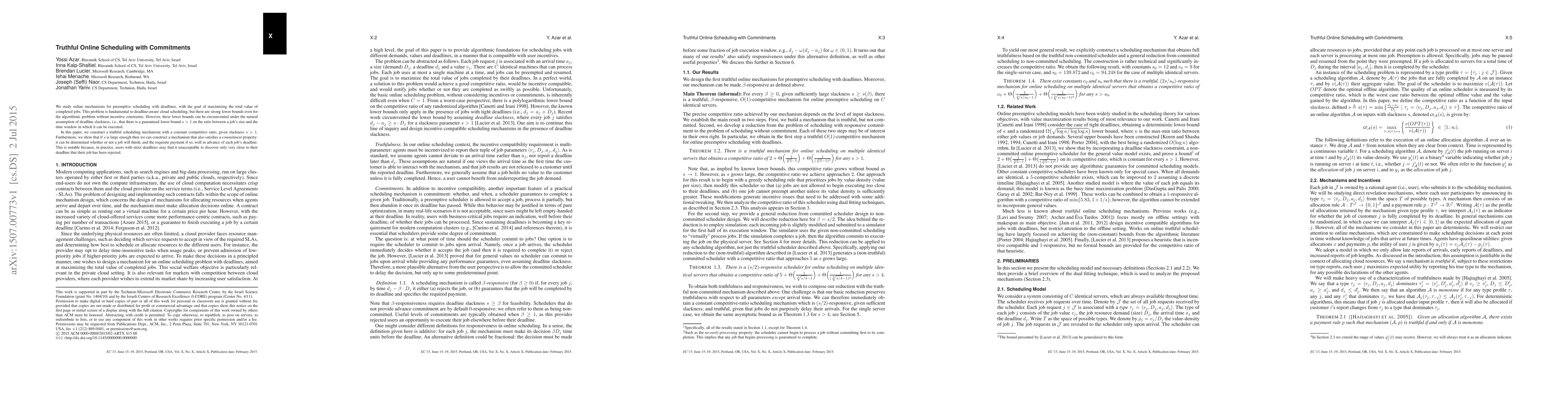 This paper proposes a truthful online scheduling mechanism that maximizes completed job value under deadlines, achieving a constant competitive ratio with guaranteed deadline slackness. It also introduces a commitment property allowing users to know job outcomes and required payments well before deadlines.