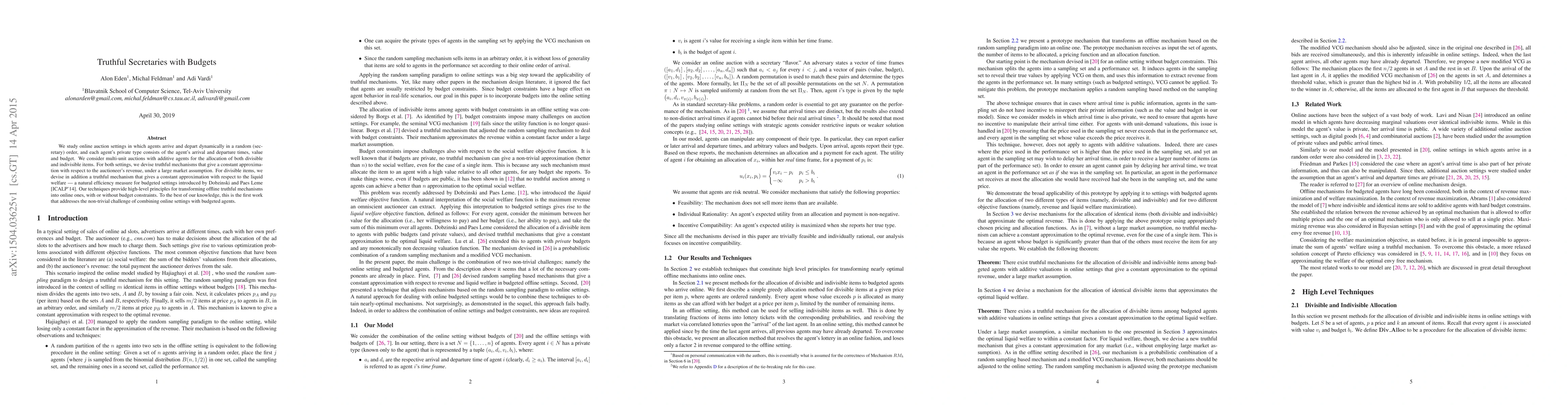 The paper studies online auction settings with dynamic agent arrivals and departures, focusing on truthful mechanisms for both divisible and indivisible items under budget constraints.