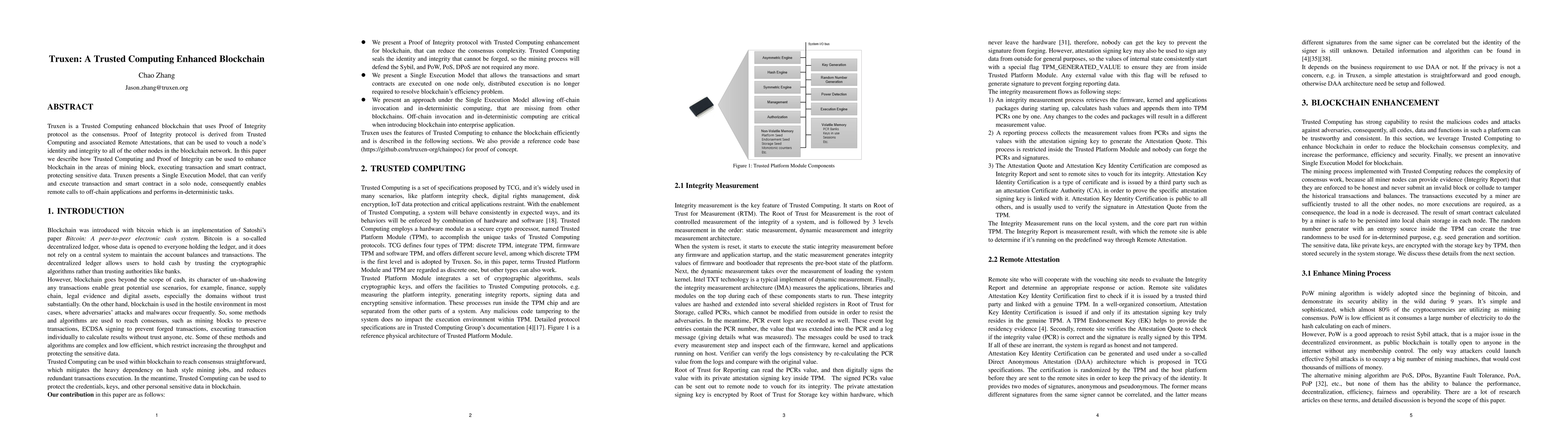 Truxen enhances blockchain with Trusted Computing and Proof of Integrity to secure mining, transactions, and smart contracts, while enabling secure off-chain interactions and indeterministic tasks through a Single Execution Model.