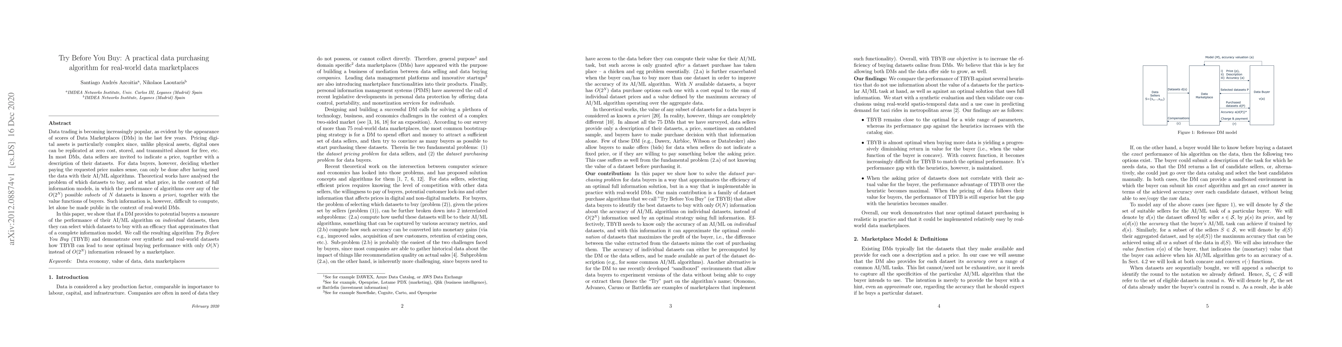 Data trading is becoming increasingly popular, as evident by the appearance of scores of Data Marketplaces (DMs) in the last few years. Pricing digital assets is particularly complex since, unlike physical assets, digital ones can be replicated at zero cost, stored, and transmitted almost for free, etc. In most DMs, data sellers are invited to indicate a price, together with a description of their datasets. For data buyers, however, deciding whether paying the requested price makes sense, can only be done after having used the data with their AI/ML algorithms. Theoretical works have analysed the problem of which datasets to buy, and at what price, in the context of full information models, in which the performance of algorithms over any of the O(2^N) possible subsets of N datasets is known a priori, together with the value functions of buyers. Such information is, however, difficult to compute, let alone be made public in the context of real-world DMs. In this paper, we show that if a DM provides to potential buyers a measure of the performance of their AI/ML algorithm on individual datasets, then they can select which datasets to buy with an efficacy that approximates that of a complete information model. We call the resulting algorithm Try Before You Buy (TBYB) and demonstrate over synthetic and real-world datasets how TBYB can lead to near optimal buying performance with only O(N) instead of O(2^N) information released by a marketplace.