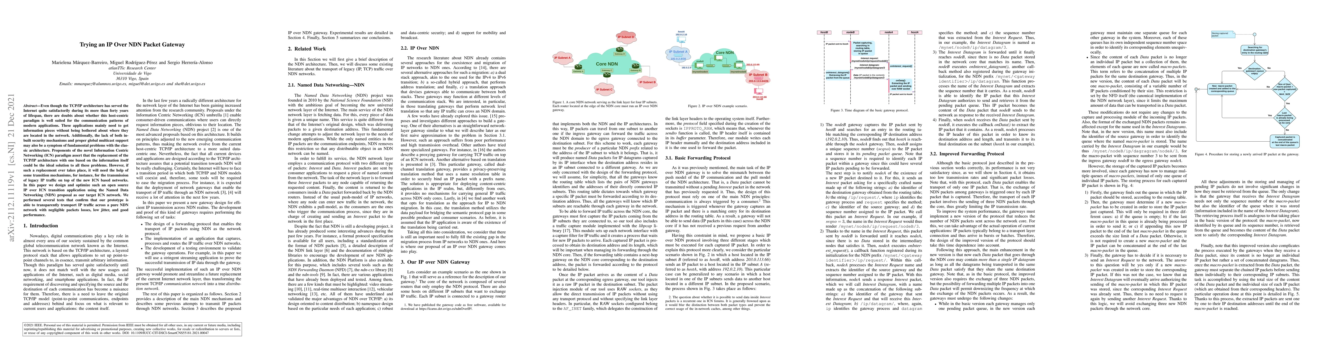 This paper designs and optimizes an open-source IP over Named Data Networking (NDN) gateway to facilitate the transition from TCP/IP to Information Centric Networking. Tests show the prototype effectively transports IP traffic across a pure NDN network with minimal packet loss and low jitter.