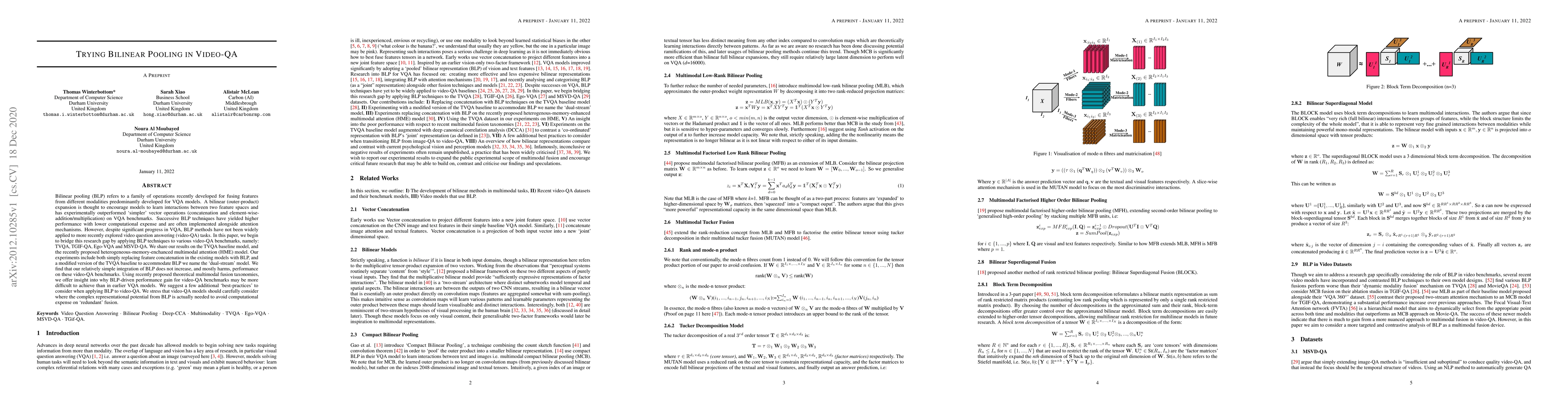 This paper explores the application of bilinear pooling (BLP) to video question answering (video-QA) tasks, finding that its straightforward integration often harms performance on benchmarks like TVQA, TGIF-QA, Ego-VQA, and MSVD-QA. The authors suggest that BLP's benefits may be harder to achieve in video-QA compared to video-question answering (VQA) due to differences in model requirements and propose best practices for its application.