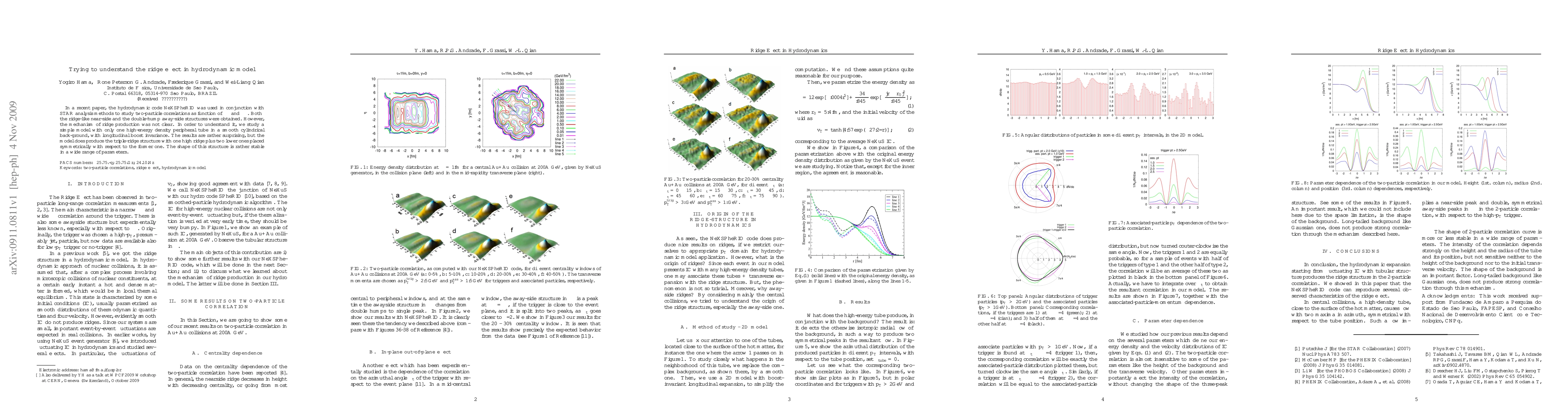In a recent paper, the hydrodynamic code NeXSPheRIO was used in conjunction with STAR analysis methods to study two-particle correlations as function of Delta_eta and Delta_phi. Both the ridge-like near-side and the double-hump away-side structures were obtained. However, the mechanism of ridge production was not clear. In order to understand it, we study a simple model with only one high-energy density peripheral tube in a smooth cylindrical back-ground, with longitudinal boost invariance. The results are rather surprising, but the model does produce the triple-ridge structure with one high ridge plus two lower ones placed symmetrically with respect to the former one. The shape of this structure is rather stable in a wide range of parameters.