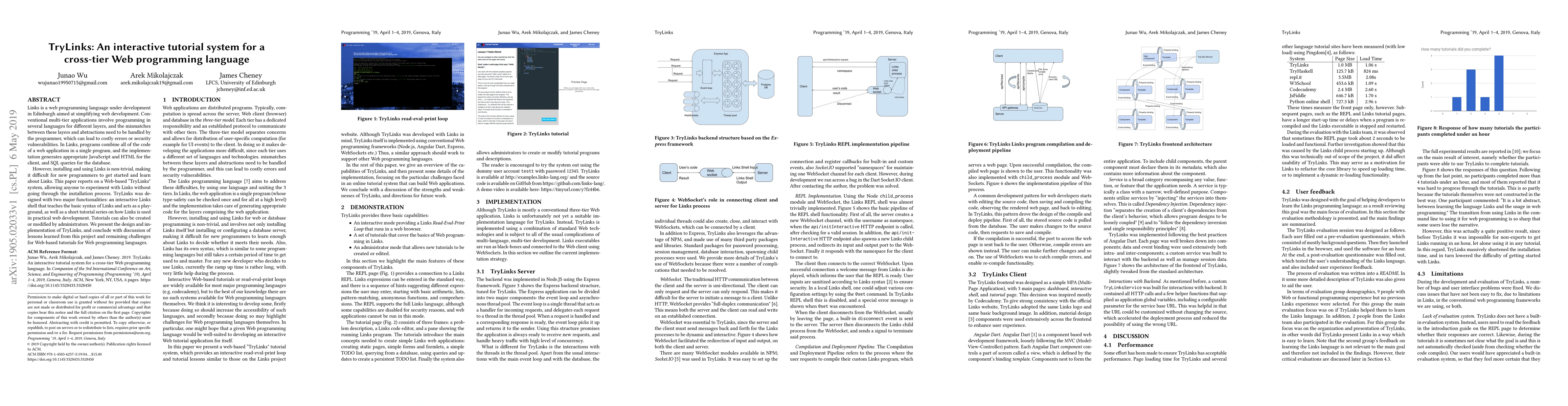 The paper introduces TryLinks, a web-based tutorial system for the Links programming language, designed to simplify web development by combining all application code in a single program. TryLinks aims to make Links accessible to new programmers through an interactive shell and tutorial series, addressing the challenges of traditional multi-tier application development.