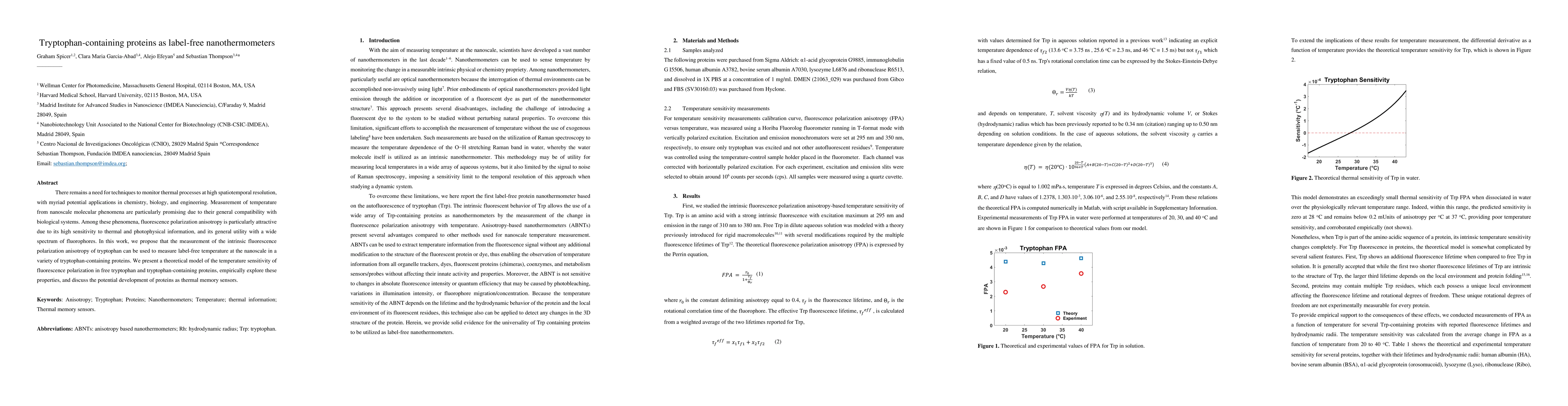 There remains a need for techniques to monitor thermal processes at high spatiotemporal resolution, with myriad potential applications in chemistry, biology, and engineering. Measurement of temperature from nanoscale molecular phenomena are particularly promising due to their general compatibility with biological systems. Among these phenomena, fluorescence polarization anisotropy is particularly attractive due to its high sensitivity to thermal and photophysical information, and its general utility with a wide spectrum of fluorophores. In this work, we propose that the measurement of the intrinsic fluorescence polarization anisotropy of tryptophan can be used to measure label-free temperature at the nanoscale in a variety of tryptophan-containing proteins. We present a theoretical model of the temperature sensitivity of fluorescence polarization in free tryptophan and tryptophan-containing proteins, empirically explore these properties, and discuss the potential development of proteins as thermal memory sensors.