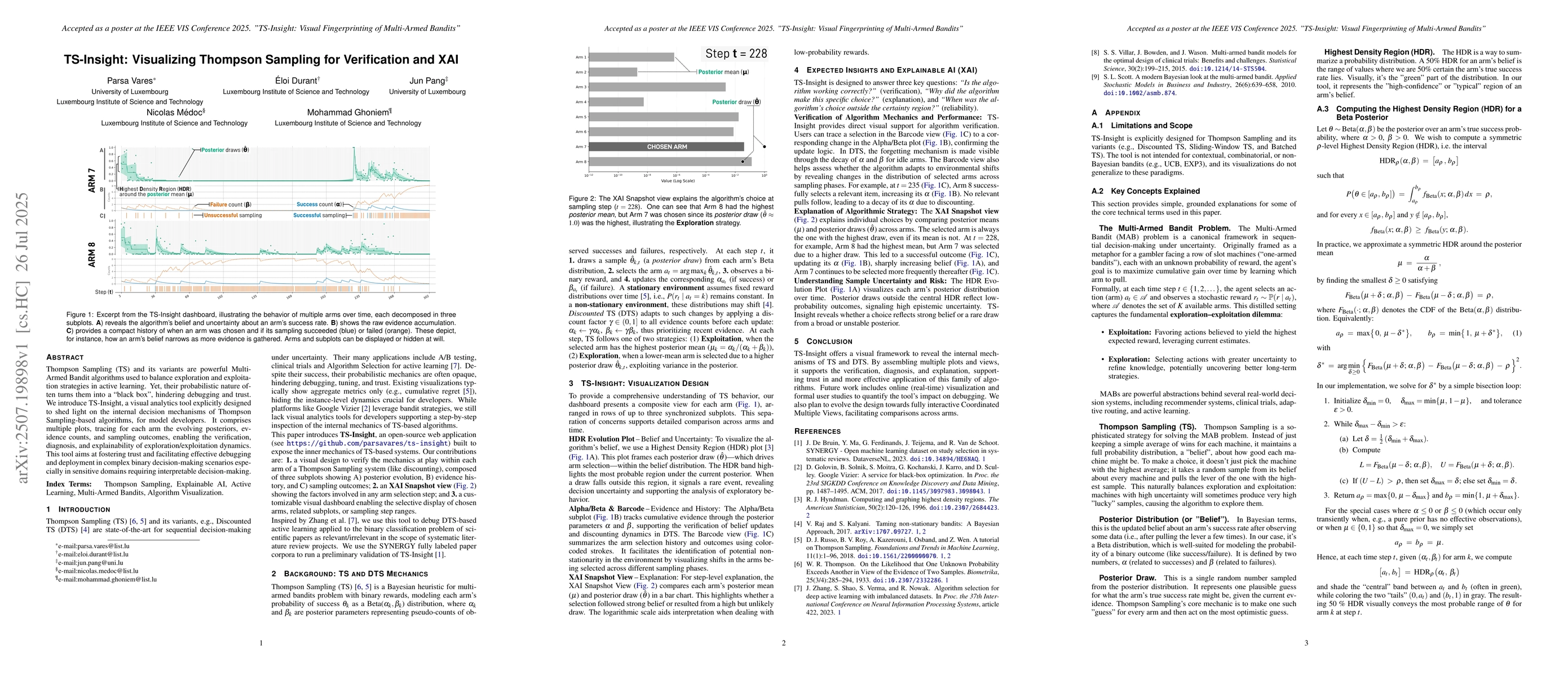 Thompson Sampling (TS) and its variants are powerful Multi-Armed Bandit algorithms used to balance exploration and exploitation strategies in active learning. Yet, their probabilistic nature often turns them into a ``black box'', hindering debugging and trust. We introduce TS-Insight, a visual analytics tool explicitly designed to shed light on the internal decision mechanisms of Thompson Sampling-based algorithms, for model developers. It comprises multiple plots, tracing for each arm the evolving posteriors, evidence counts, and sampling outcomes, enabling the verification, diagnosis, and explainability of exploration/exploitation dynamics. This tool aims at fostering trust and facilitating effective debugging and deployment in complex binary decision-making scenarios especially in sensitive domains requiring interpretable decision-making.