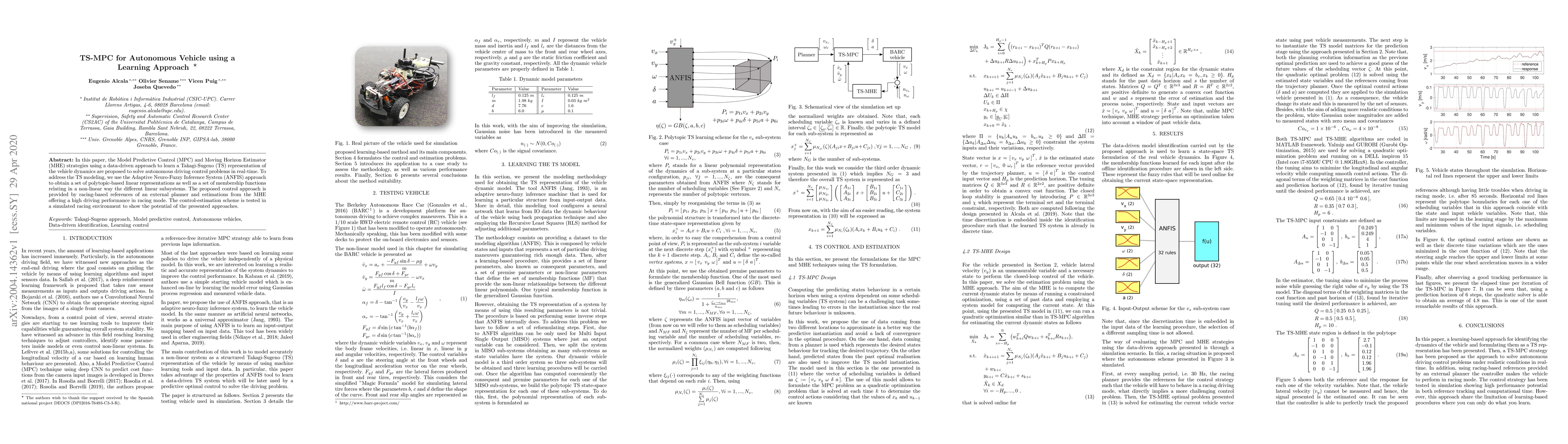 In this paper, the Model Predictive Control (MPC) and Moving Horizon Estimator (MHE) strategies using a data-driven approach to learn a Takagi-Sugeno (TS) representation of the vehicle dynamics are proposed to solve autonomous driving control problems in real-time. To address the TS modeling, we use the Adaptive Neuro-Fuzzy Inference System (ANFIS) approach to obtain a set of polytopic-based linear representations as well as a set of membership functions relating in a non-linear way the different linear subsystems. The proposed control approach is provided by racing-based references of an external planner and estimations from the MHE offering a high driving performance in racing mode. The control-estimation scheme is tested in a simulated racing environment to show the potential of the presented approaches.