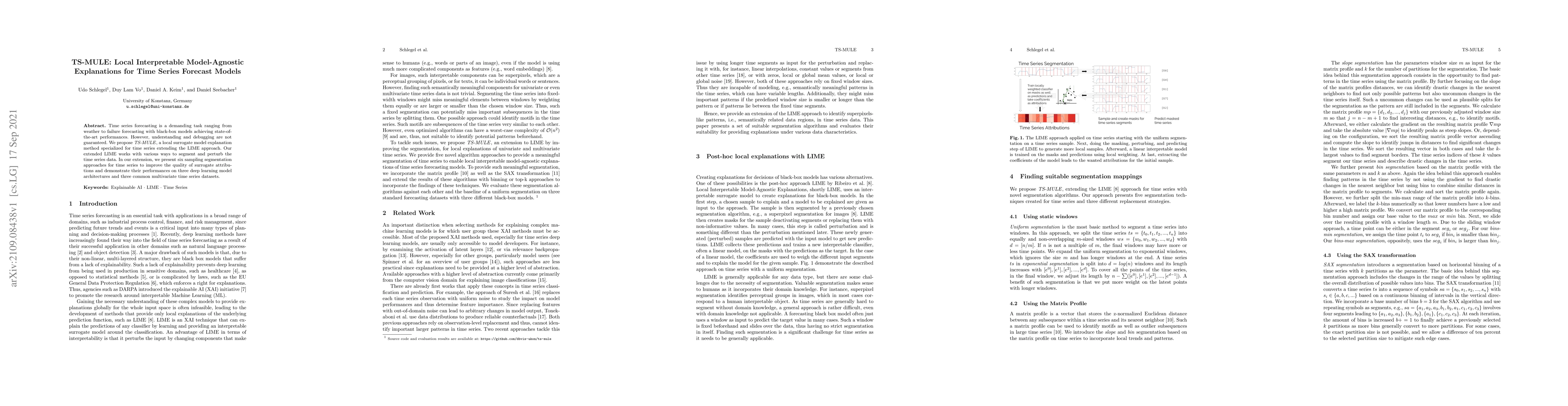 Time series forecasting is a demanding task ranging from weather to failure forecasting with black-box models achieving state-of-the-art performances. However, understanding and debugging are not guaranteed. We propose TS-MULE, a local surrogate model explanation method specialized for time series extending the LIME approach. Our extended LIME works with various ways to segment and perturb the time series data. In our extension, we present six sampling segmentation approaches for time series to improve the quality of surrogate attributions and demonstrate their performances on three deep learning model architectures and three common multivariate time series datasets.