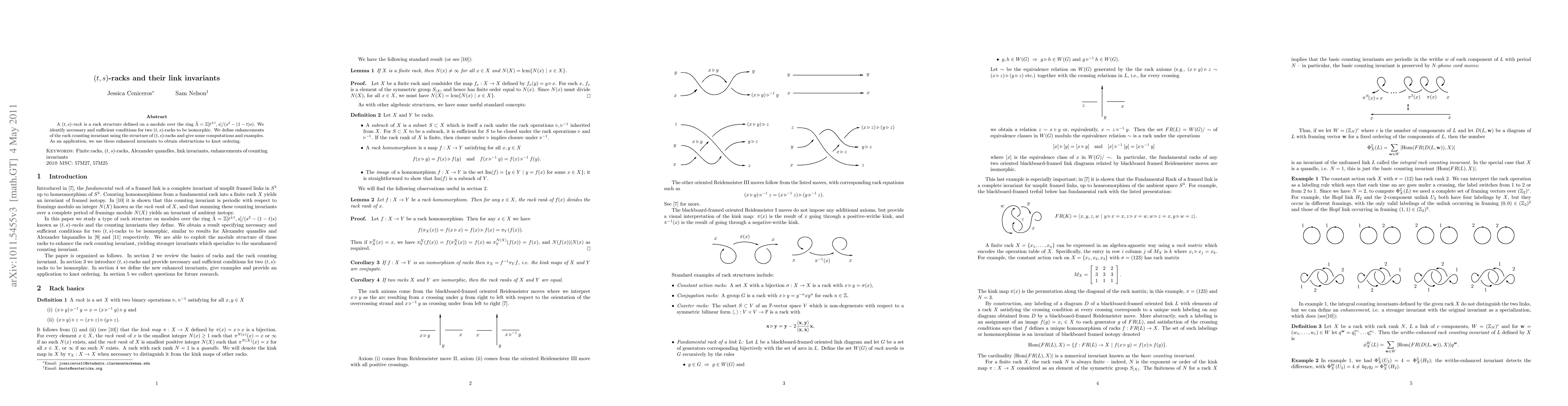 This paper investigates the algebraic structure of (t,s)-racks over a specific ring, identifying conditions for their isomorphism and enhancing rack counting invariants. It applies these enhancements to compute obstructions for knot ordering.