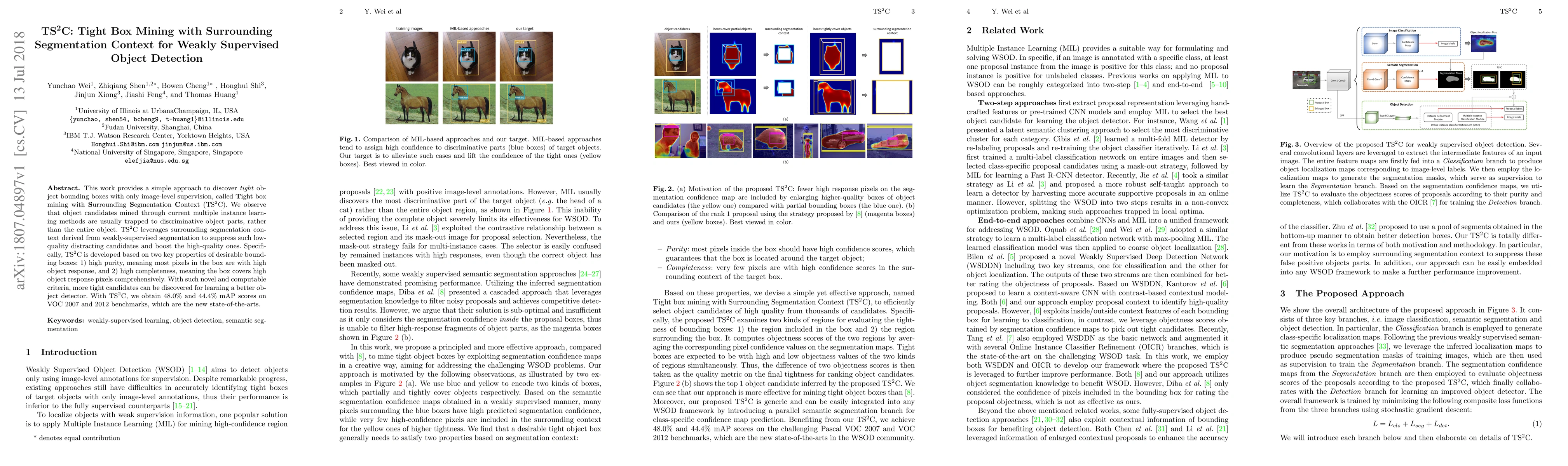 This work provides a simple approach to discover tight object bounding boxes with only image-level supervision, called Tight box mining with Surrounding Segmentation Context (TS2C). We observe that object candidates mined through current multiple instance learning methods are usually trapped to discriminative object parts, rather than the entire object. TS2C leverages surrounding segmentation context derived from weakly-supervised segmentation to suppress such low-quality distracting candidates and boost the high-quality ones. Specifically, TS2C is developed based on two key properties of desirable bounding boxes: 1) high purity, meaning most pixels in the box are with high object response, and 2) high completeness, meaning the box covers high object response pixels comprehensively. With such novel and computable criteria, more tight candidates can be discovered for learning a better object detector. With TS2C, we obtain 48.0% and 44.4% mAP scores on VOC 2007 and 2012 benchmarks, which are the new state-of-the-arts.