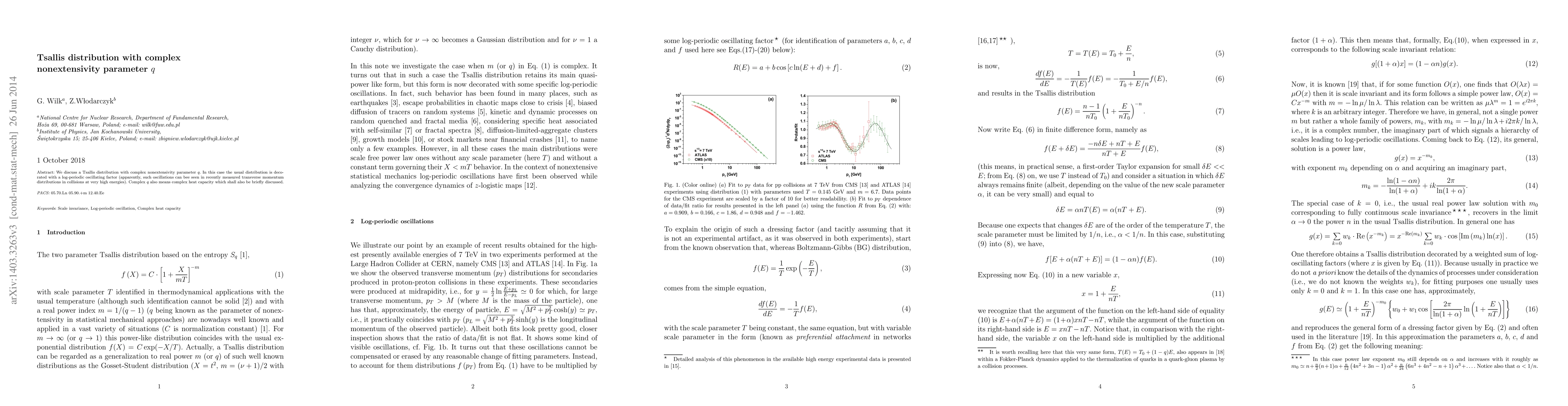 This paper explores the Tsallis distribution with a complex nonextensivity parameter $q$, introducing a log-periodic oscillating factor that may explain recent high-energy collision data. It also touches on the implications of complex $q$ for heat capacity.