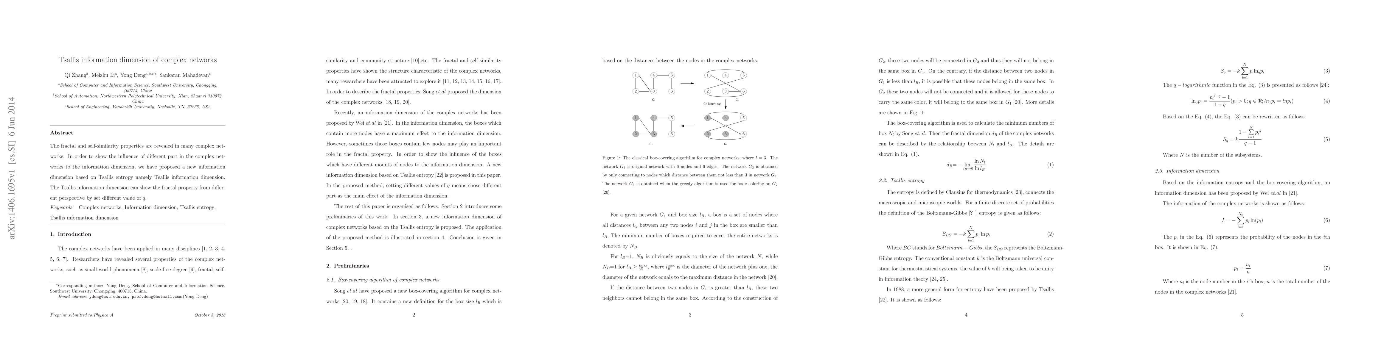 The paper proposes a new information dimension based on Tsallis entropy to analyze the fractal properties of complex networks. By varying the parameter q, the Tsallis information dimension reveals different aspects of the network's self-similarity.