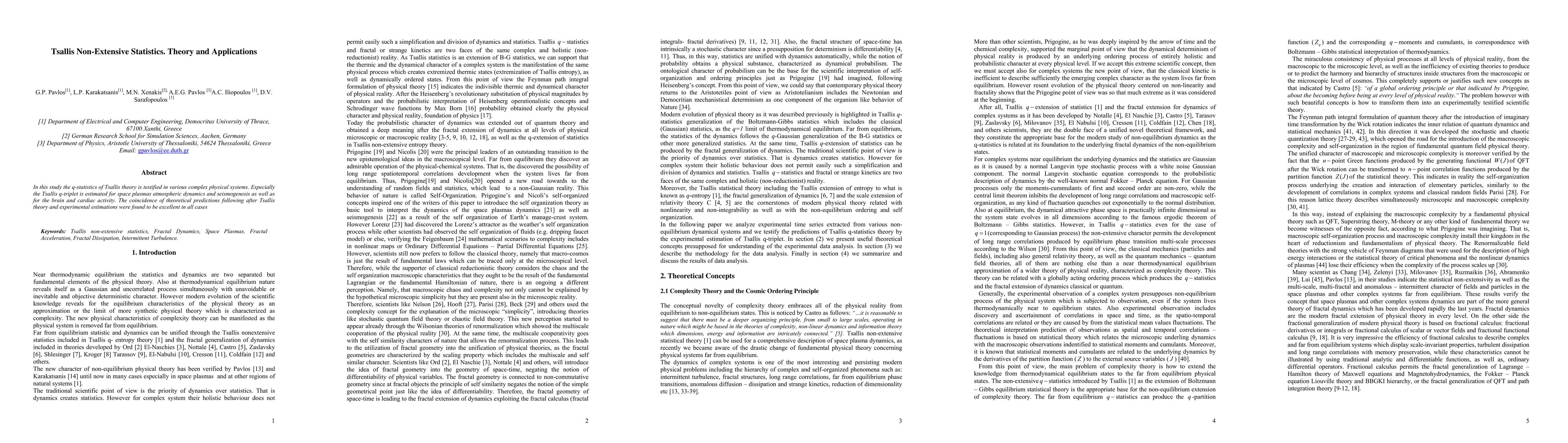In this study the q-statistics of Tsallis theory is testified in various complex physical systems. Especially the Tsallis q-triplet is estimated for space plasmas atmospheric dynamics and seismogenesis as well as for the brain and cardiac activity. The coincidence of theoretical predictions following after Tsallis theory and experimental estimations were found to be excellent in all cases