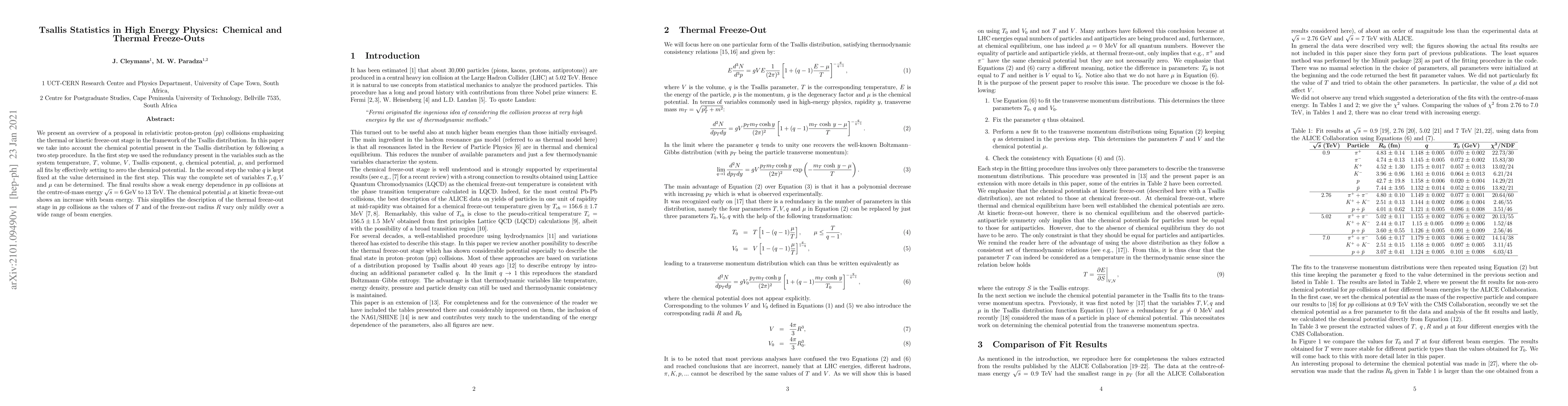 We present an overview of a proposal in relativistic proton-proton ($pp$) collisions emphasizing the thermal or kinetic freeze-out stage in the framework of the Tsallis distribution. In this paper we take into account the chemical potential present in the Tsallis distribution by following a two step procedure. In the first step we used the redundancy present in the variables such as the system temperature, $T$, volume, $V$, Tsallis exponent, $q$, chemical potential, $\mu$, and performed all fits by effectively setting to zero the chemical potential. In the second step the value $q$ is kept fixed at the value determined in the first step. This way the complete set of variables $T, q, V$ and $\mu$ can be determined. The final results show a weak energy dependence in $pp$ collisions at the centre-of-mass energy $\sqrt{s}= 6$ GeV to 13 TeV. The chemical potential $\mu$ at kinetic freeze-out shows an increase with beam energy. This simplifies the description of the thermal freeze-out stage in $pp$ collisions as the values of $T$ and of the freeze-out radius $R$ vary only mildly over a wide range of beam energies.