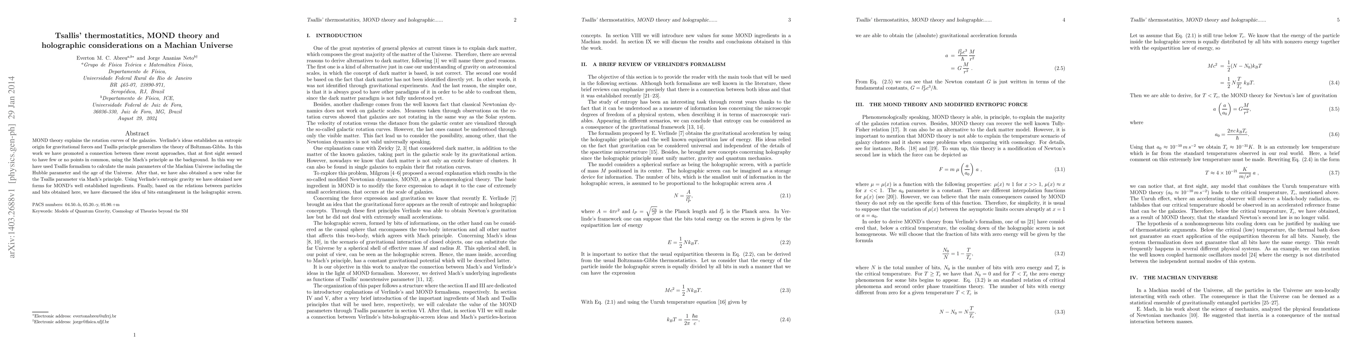 MOND theory explains the rotation curves of the galaxies. Verlinde's ideas establishes an entropic origin for gravitational forces and Tsallis principle generalizes the theory of Boltzman-Gibbs. In this work we have promoted a connection between these recent approaches, that at first sight seemed to have few or no points in common, using the Mach's principle as the background. In this way we have used Tsallis formalism to calculate the main parameters of the Machian Universe including the Hubble parameter and the age of the Universe. After that, we have also obtained a new value for the Tsallis parameter via Mach's principle. Using Verlinde's entropic gravity we have obtained new forms for MOND's well established ingredients. Finally, based on the relations between particles and bits obtained here, we have discussed the idea of bits entanglement in the holographic screen.