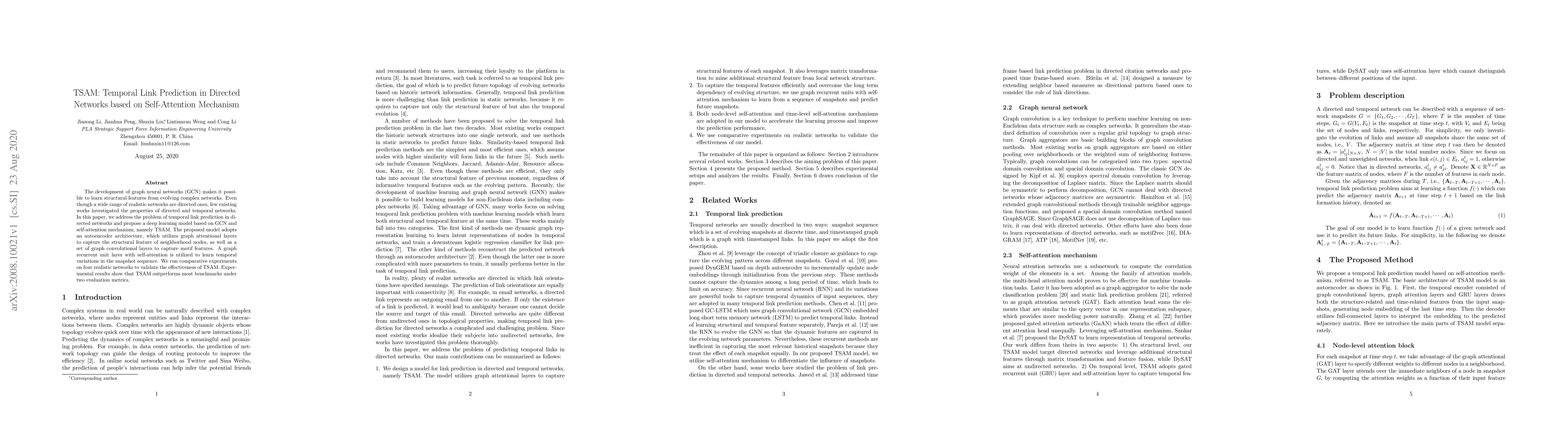 This paper proposes TSAM, a deep learning model combining graph neural networks and self-attention mechanisms for temporal link prediction in directed networks. TSAM uses an autoencoder architecture with graph attentional and convolutional layers to capture structural and motif features, and a graph recurrent unit with self-attention to model temporal dynamics, outperforming benchmarks on four datasets.