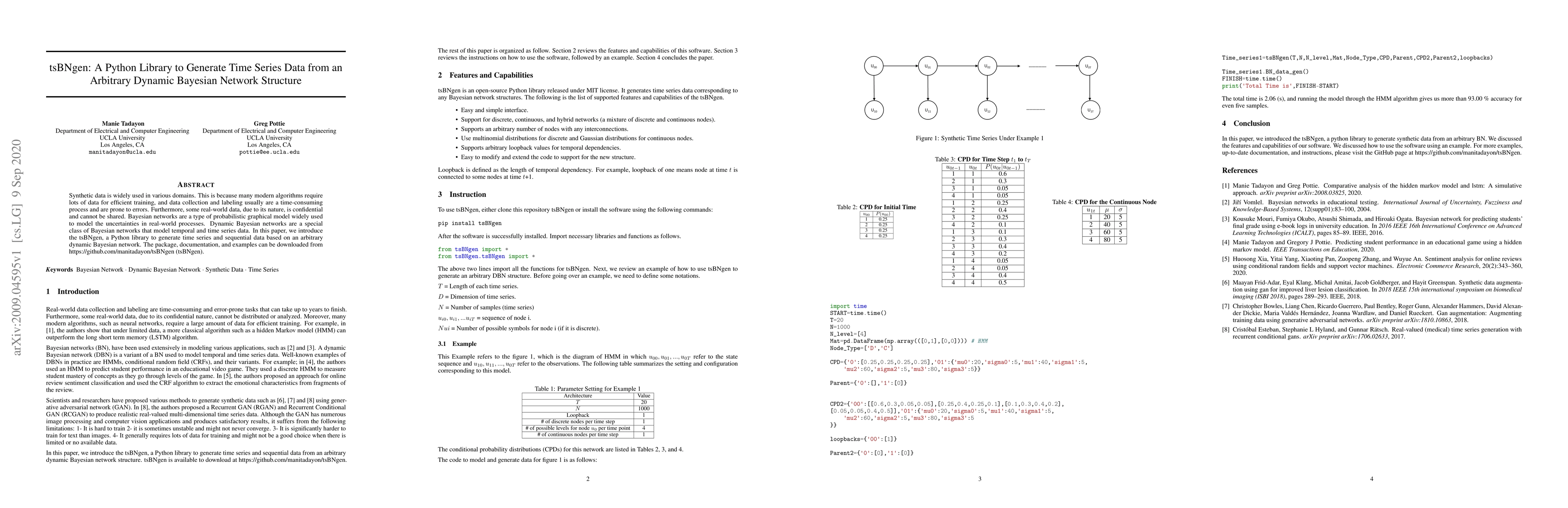 Synthetic data is widely used in various domains. This is because many modern algorithms require lots of data for efficient training, and data collection and labeling usually are a time-consuming process and are prone to errors. Furthermore, some real-world data, due to its nature, is confidential and cannot be shared. Bayesian networks are a type of probabilistic graphical model widely used to model the uncertainties in real-world processes. Dynamic Bayesian networks are a special class of Bayesian networks that model temporal and time series data. In this paper, we introduce the tsBNgen, a Python library to generate time series and sequential data based on an arbitrary dynamic Bayesian network. The package, documentation, and examples can be downloaded from https://github.com/manitadayon/tsBNgen.