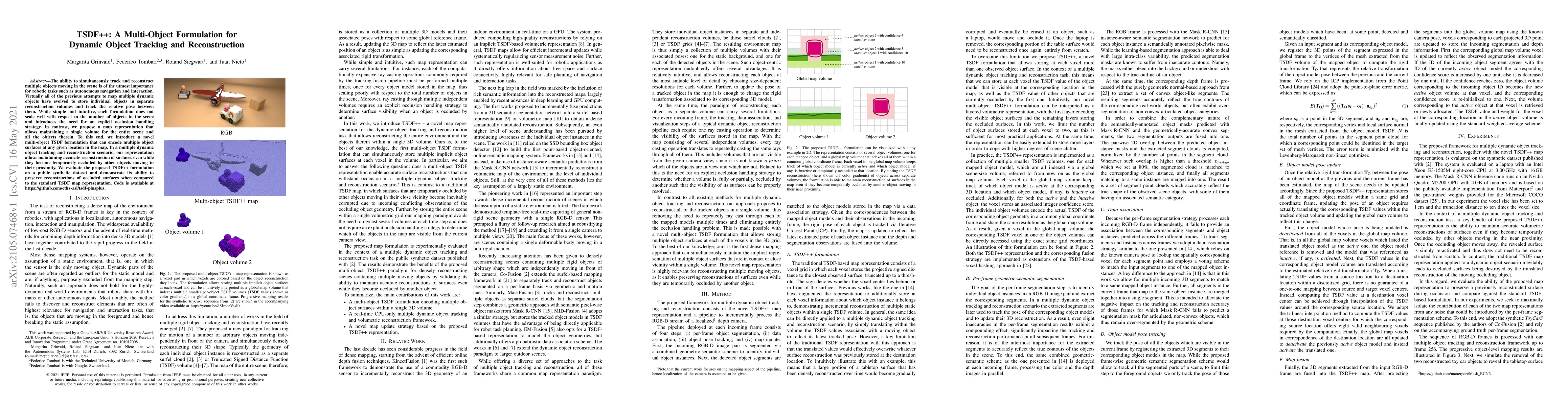 The ability to simultaneously track and reconstruct multiple objects moving in the scene is of the utmost importance for robotic tasks such as autonomous navigation and interaction. Virtually all of the previous attempts to map multiple dynamic objects have evolved to store individual objects in separate reconstruction volumes and track the relative pose between them. While simple and intuitive, such formulation does not scale well with respect to the number of objects in the scene and introduces the need for an explicit occlusion handling strategy. In contrast, we propose a map representation that allows maintaining a single volume for the entire scene and all the objects therein. To this end, we introduce a novel multi-object TSDF formulation that can encode multiple object surfaces at any given location in the map. In a multiple dynamic object tracking and reconstruction scenario, our representation allows maintaining accurate reconstruction of surfaces even while they become temporarily occluded by other objects moving in their proximity. We evaluate the proposed TSDF++ formulation on a public synthetic dataset and demonstrate its ability to preserve reconstructions of occluded surfaces when compared to the standard TSDF map representation.
