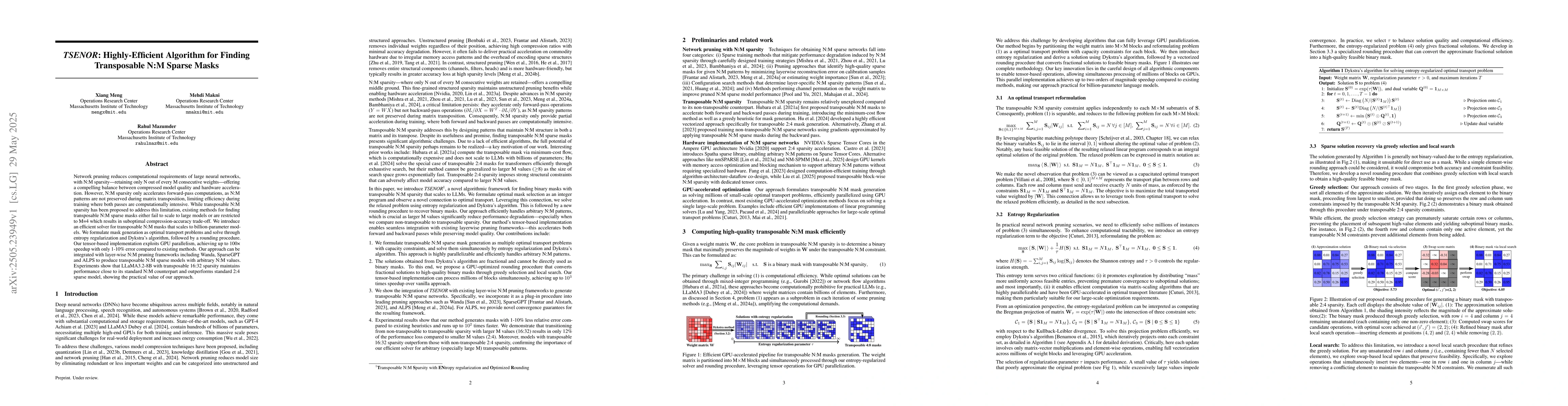 This paper introduces TSENOR, an efficient algorithm for finding transposable N:M sparse masks in neural networks, achieving up to 100x speedup with minimal error and supporting large models.