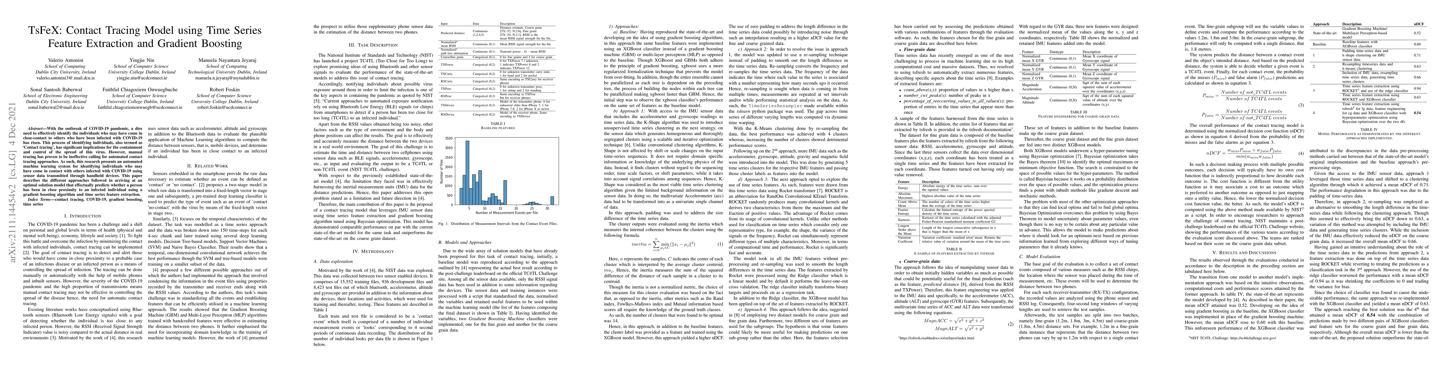 With the outbreak of COVID-19 pandemic, a dire need to effectively identify the individuals who may have come in close-contact to others who have been infected with COVID-19 has risen. This process of identifying individuals, also termed as 'Contact tracing', has significant implications for the containment and control of the spread of this virus. However, manual tracing has proven to be ineffective calling for automated contact tracing approaches. As such, this research presents an automated machine learning system for identifying individuals who may have come in contact with others infected with COVID-19 using sensor data transmitted through handheld devices. This paper describes the different approaches followed in arriving at an optimal solution model that effectually predicts whether a person has been in close proximity to an infected individual using a gradient boosting algorithm and time series feature extraction.