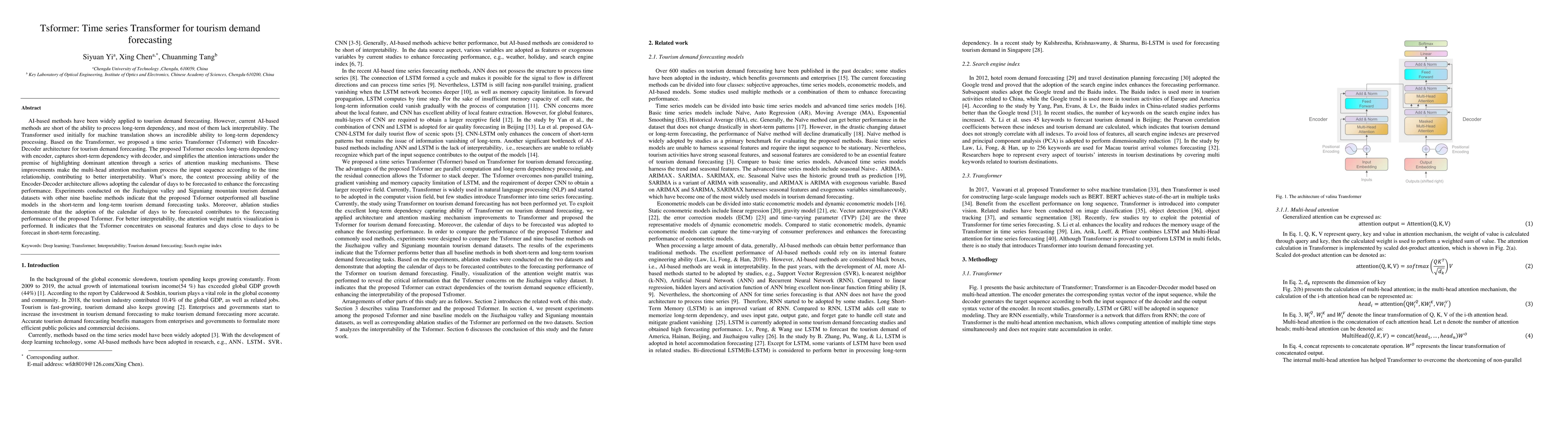The Tsformer model leverages a Transformer architecture for improved tourism demand forecasting, addressing long-term dependency and interpretability issues. Experimental results show superior performance compared to baseline methods and highlight the effectiveness of incorporating the calendar of days to be forecasted.