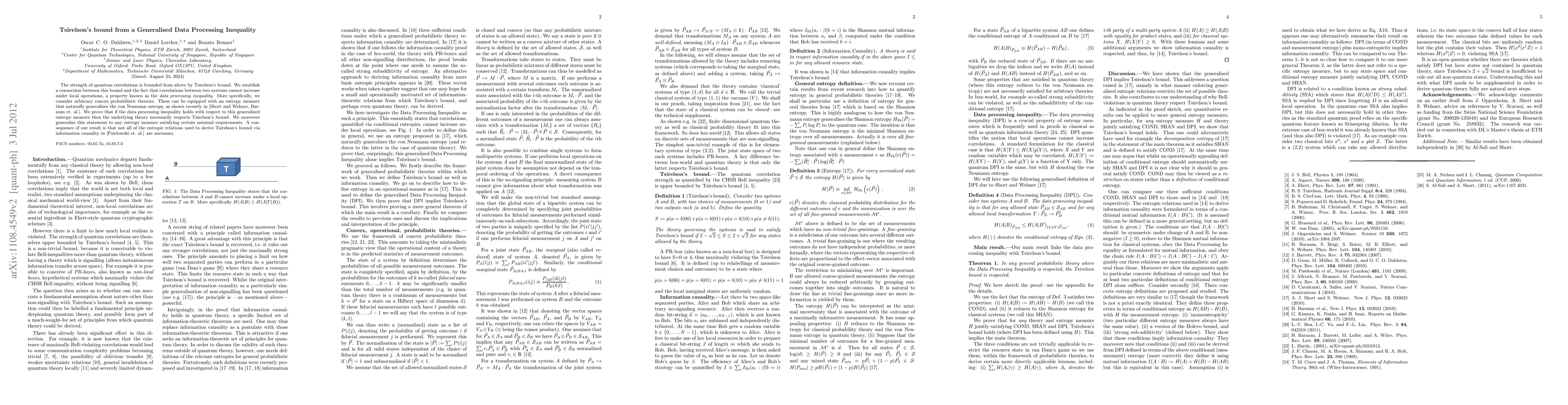 This paper establishes a link between Tsirelson's bound and the generalised data processing inequality, showing that any theory respecting the latter must adhere to the former. It generalises this result to any entropy measure meeting minimal criteria, implying that not all entropic relations used in previous derivations are necessary.