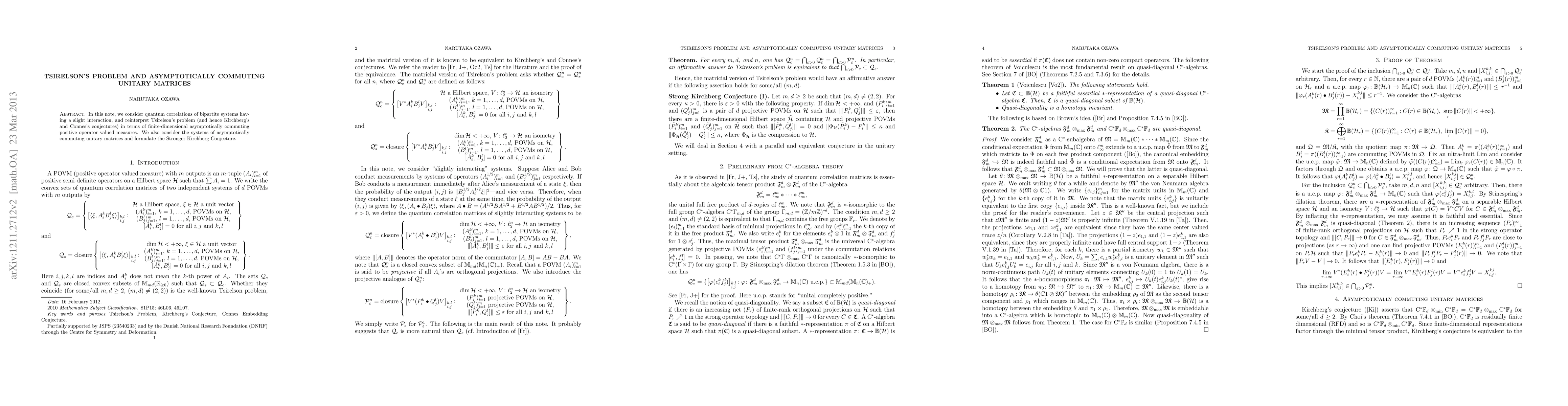 This paper reinterprets Tsirelson's problem in the context of finite-dimensional asymptotically commuting positive operator valued measures, and introduces the Stronger Kirchberg Conjecture regarding systems of asymptotically commuting unitary matrices.