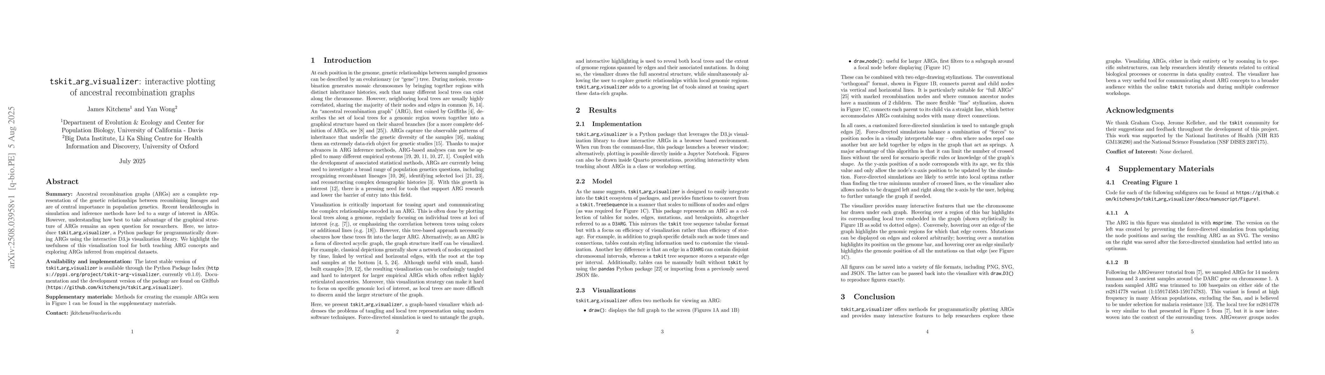 Summary: Ancestral recombination graphs (ARGs) are a complete representation of the genetic relationships between recombining lineages and are of central importance in population genetics. Recent breakthroughs in simulation and inference methods have led to a surge of interest in ARGs. However, understanding how best to take advantage of the graphical structure of ARGs remains an open question for researchers. Here, we introduce tskit_arg_visualizer, a Python package for programmatically drawing ARGs using the interactive D3.js visualization library. We highlight the usefulness of this visualization tool for both teaching ARG concepts and exploring ARGs inferred from empirical datasets. Availability and implementation: The latest stable version of tskit_arg_visualizer is available through the Python Package Index (https://pypi.org/project/tskit-arg-visualizer, currently v0.1.0). Documentation and the development version of the package are found on GitHub (https://github.com/kitchensjn/tskit_arg_visualizer). Supplementary materials: Methods for creating the example ARGs seen in Figure 1 can be found in the supplementary materials.