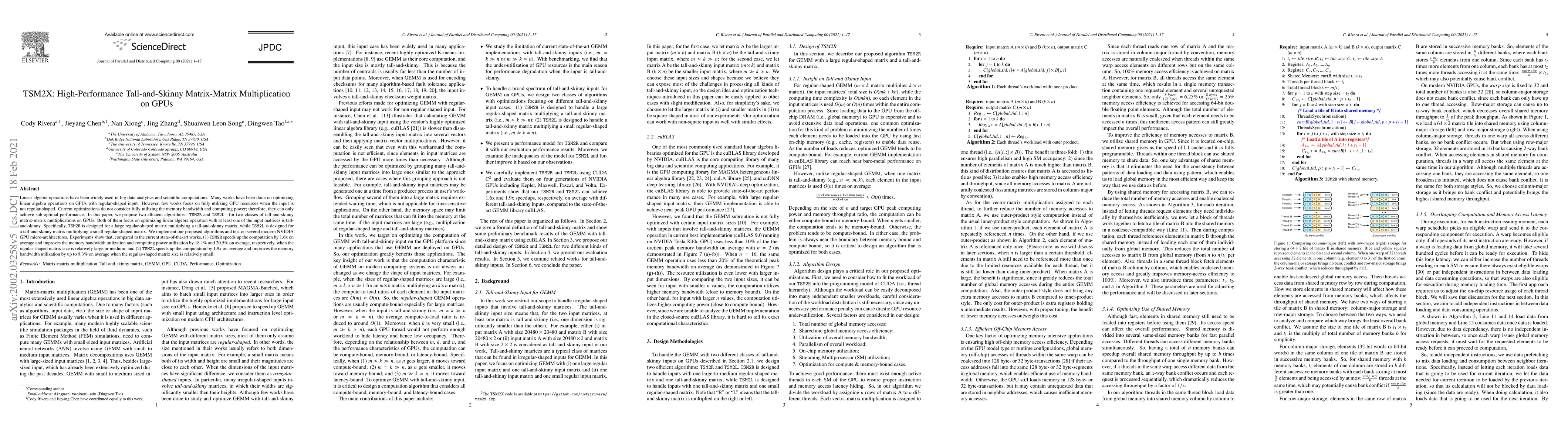 This paper proposes two algorithms, TSM2R and TSM2L, to optimize tall-and-skinny matrix-matrix multiplications on GPUs, achieving up to 3x speedup and significantly improved memory and computing power utilization compared to existing methods.