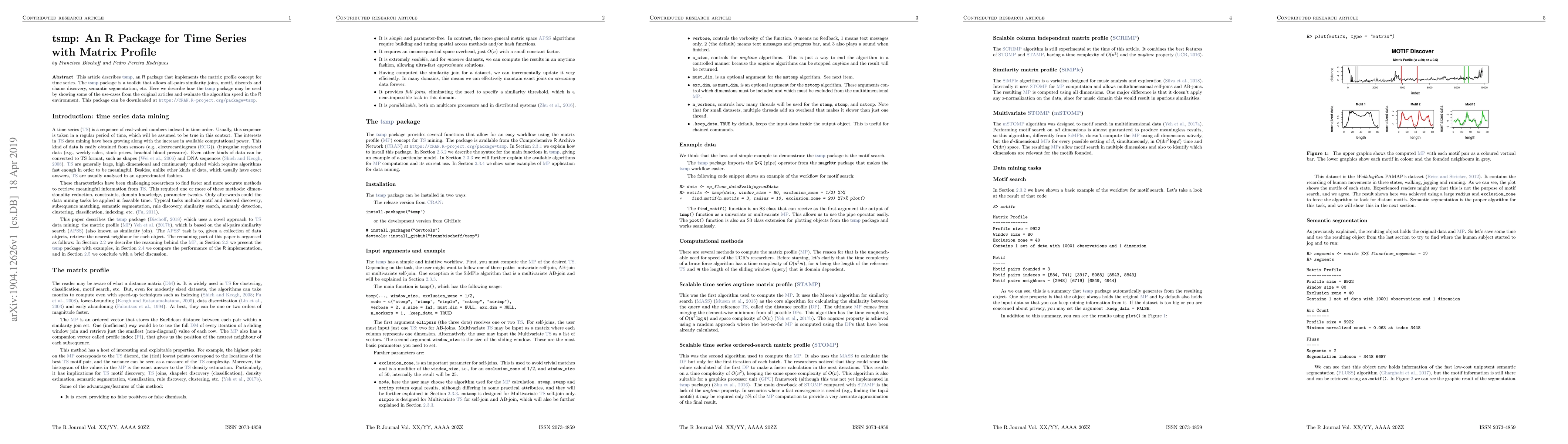The tsmp R package implements the matrix profile concept for time series analysis, enabling functions such as all-pairs similarity joins, motif and discords discovery, and semantic segmentation. The package is evaluated for speed in the R environment and is available for download from CRAN.
