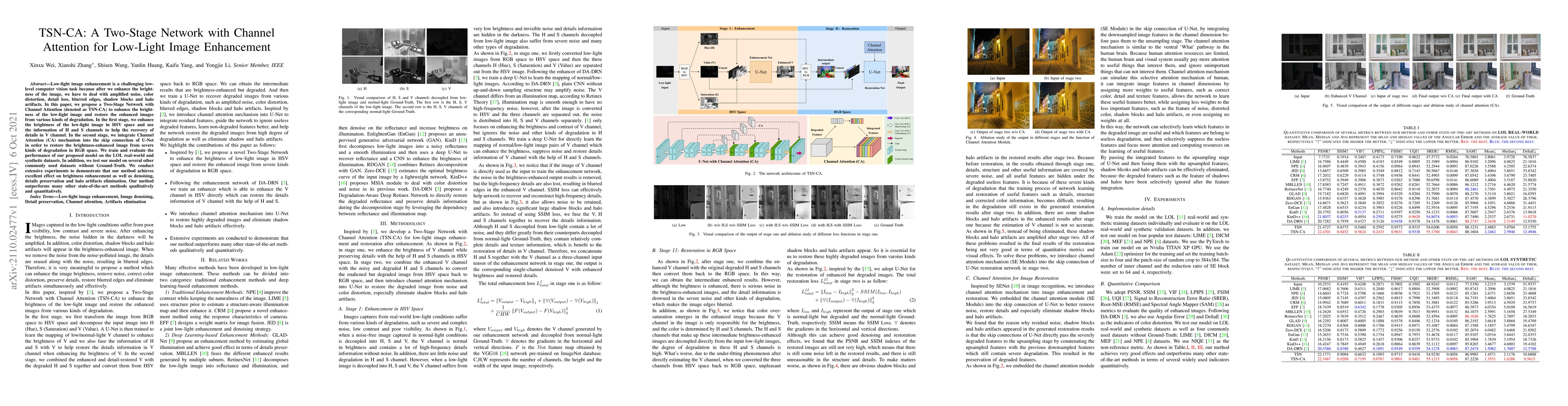 The TSN-CA model proposes a two-stage network with Channel Attention to enhance low-light images by first improving brightness in HSV space and then restoring details using a Channel Attention mechanism in the U-Net architecture. The method outperforms other state-of-the-art techniques in brightness enhancement, noise reduction, and artifact elimination.