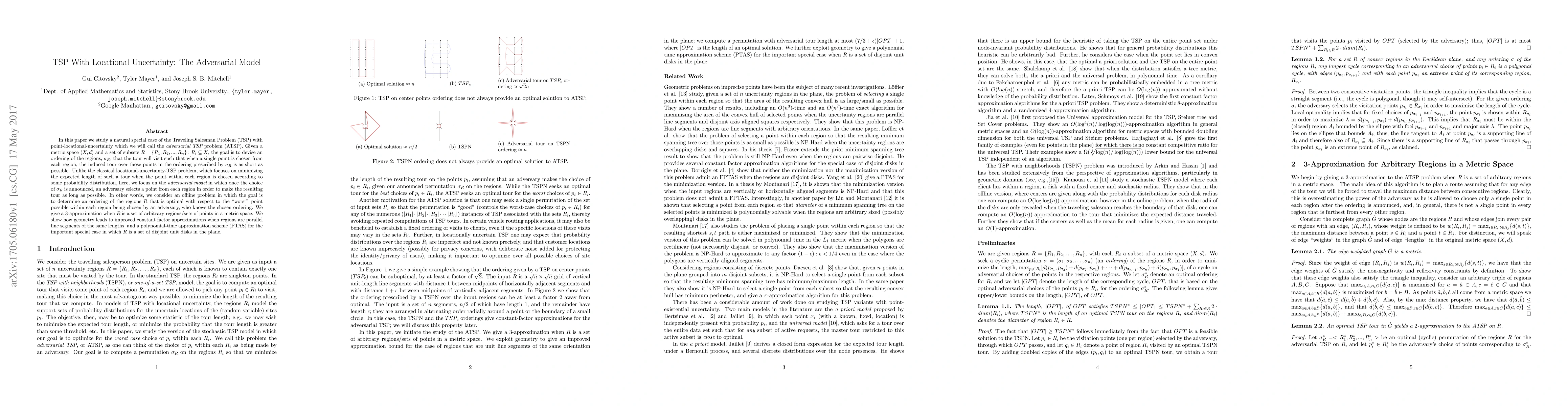 The paper studies a variation of the Traveling Salesman Problem that considers point-locational-uncertainty, where an adversary tries to maximize the tour length after choosing points from regions with given probabilities or distributions.