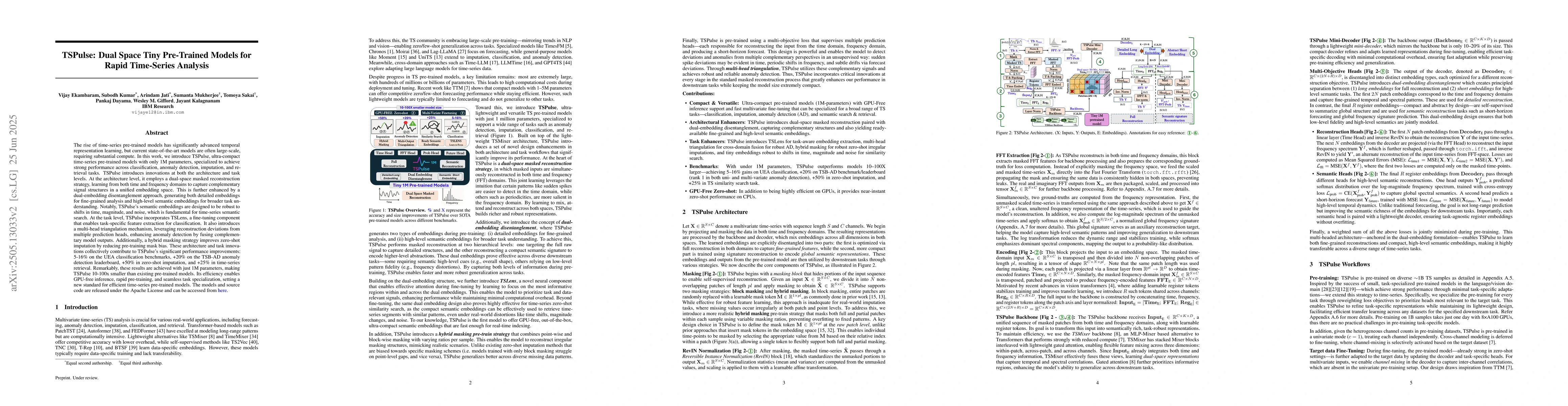 The paper introduces TSPulse, a dual-space tiny pre-trained model for time-series analysis, utilizing dual-space masked reconstruction, dual-embedding disentanglement, TSLens, multi-head triangulation, and hybrid mask pretraining techniques.