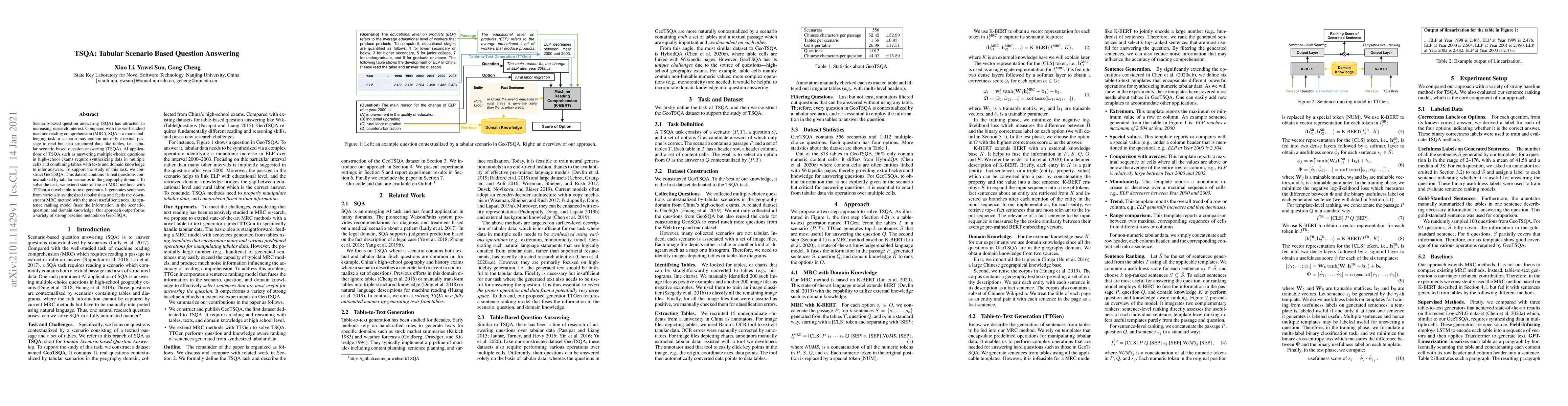 Researchers developed GeoTSQA, a dataset for tabular scenario-based question answering in geography, and introduced TTGen, a novel method that generates useful sentences from tabular data to improve machine reading comprehension.
