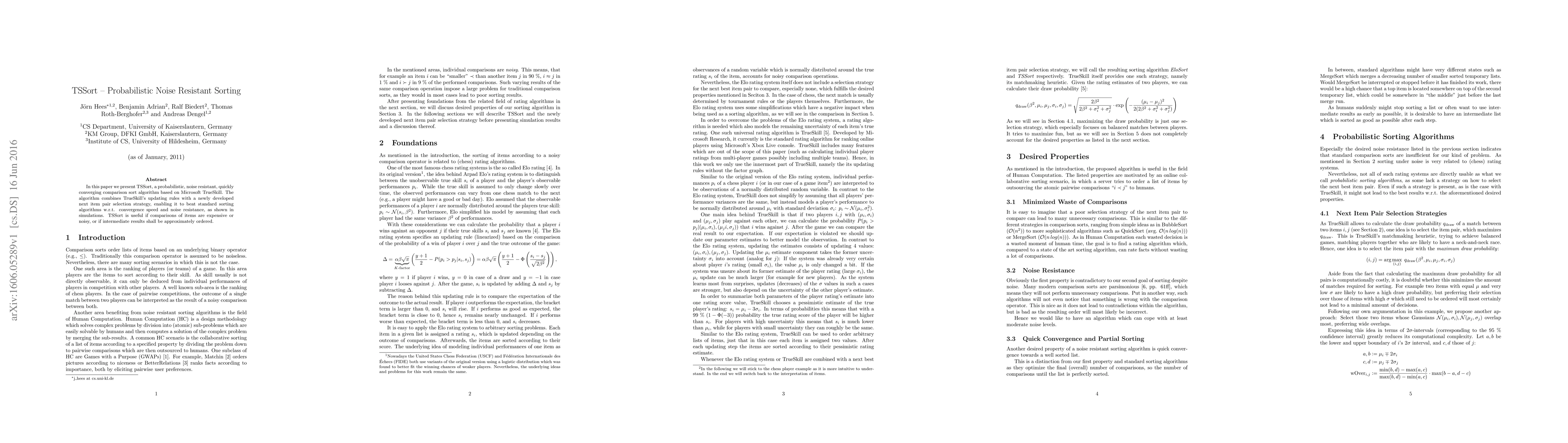 TSSort is a probabilistic sorting algorithm that outperforms traditional algorithms in terms of convergence speed and noise resistance, making it suitable for applications with expensive or noisy comparisons.