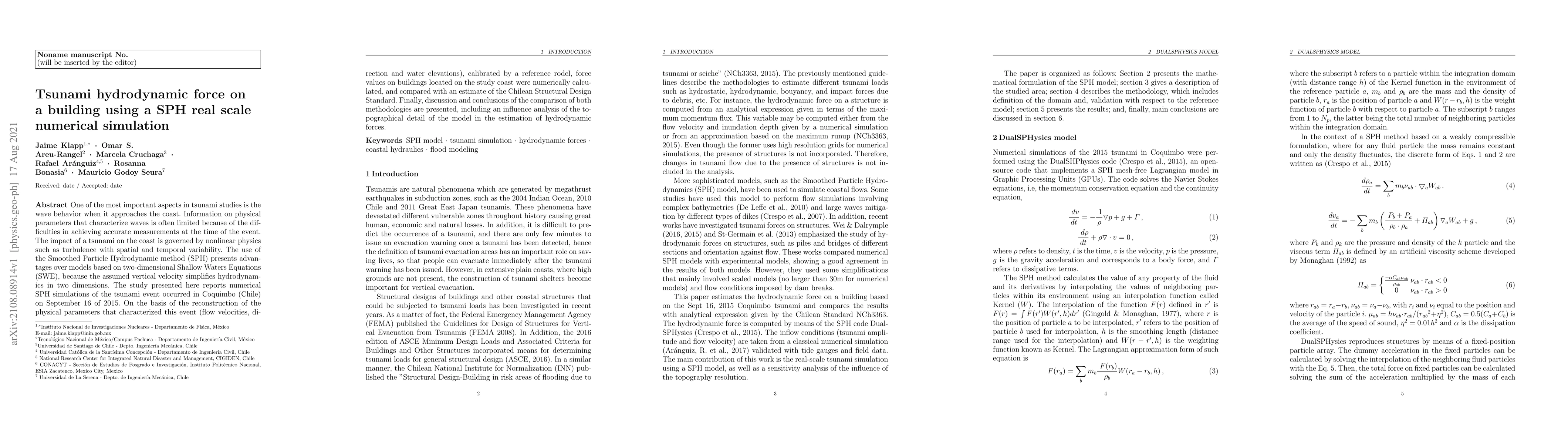 One of the most important aspects in tsunami studies is the wave behavior when it approaches the coast. Information on physical parameters that characterize waves is often limited because of the diffilculties in achieving accurate measurements at the time of the event. The impact of a tsunami on the coast is governed by nonlinear physics such as turbulence with spatial and temporal variability. The use of the Smoothed Particle Hydrodynamic method (SPH) presents advantages over models based on two-dimensional Shallow Waters Equations (SWE), because the assumed vertical velocity simplifies hydrodynamics in two dimensions. The study presented here reports numerical SPH simulations of the tsunami event occurred in Coquimbo (Chile) on September 16 of 2015. On the basis of the reconstruction of the physical parameters that characterized this event (flow velocities, direction and water elevations), calibrated by a reference rodel, force values on buildings located on the study coast were numerically calculated, and compared with an estimate of the Chilean Structural Design Standard. Finally, discussion and conclusions of the comparison of both methodologies are presented, including an influence analysis of the topographical detail of the model in the estimation of hydrodynamic forces.