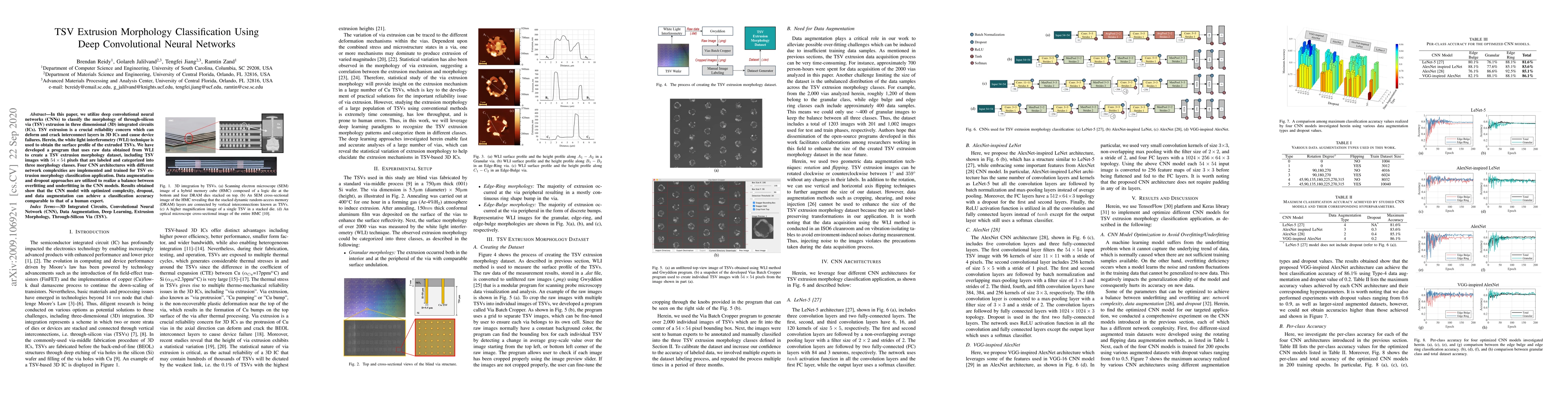 This research paper explores the use of deep convolutional neural networks (CNNs) to classify the morphology of through-silicon via (TSV) extrusion in 3D integrated circuits, addressing a critical reliability concern. The study employs white light interferometry (WLI) to capture TSV surface profiles and trains various CNN architectures to achieve high classification accuracy, comparable to human experts, by balancing overfitting and underfitting through data augmentation and dropout techniques.