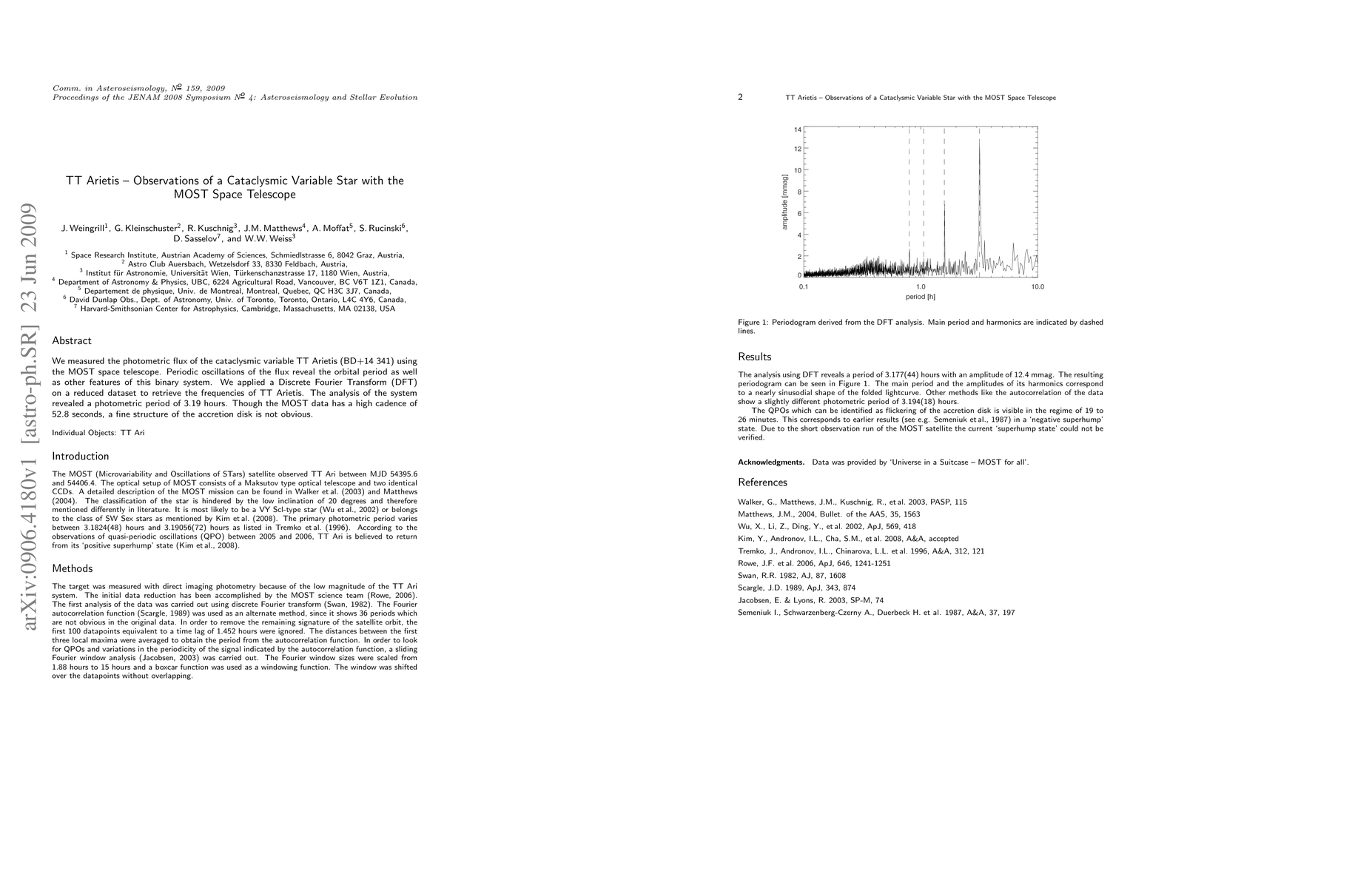 We measured the photometric flux of the cataclysmic variable TT Arietis (BD+14 341) using the MOST space telescope. Periodic oscillations of the flux reveal the orbital period as well as other features of this binary system. We applied a Discrete Fourier Transform (DFT) on a reduced dataset to retrieve the frequencies of TT Arietis. The analysis of the system revealed a photometric period of 3.19 hours. Though the MOST data has a high cadence of 52.8 seconds, a fine structure of the accretion disk is not obvious.