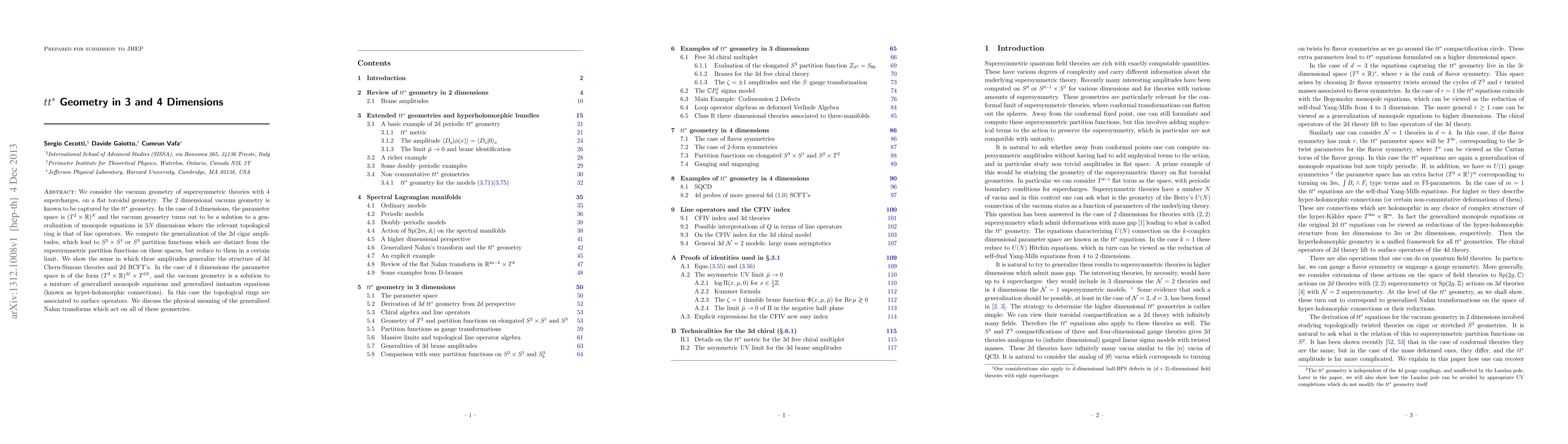 We consider the vacuum geometry of supersymmetric theories with 4 supercharges, on a flat toroidal geometry. The 2 dimensional vacuum geometry is known to be captured by the $tt^*$ geometry. In the case of 3 dimensions, the parameter space is $(T^{2}\times {\mathbb R})^N$ and the vacuum geometry turns out to be a solution to a generalization of monopole equations in $3N$ dimensions where the relevant topological ring is that of line operators. We compute the generalization of the 2d cigar amplitudes, which lead to $S^2\times S^1$ or $S^3$ partition functions which are distinct from the supersymmetric partition functions on these spaces, but reduce to them in a certain limit. We show the sense in which these amplitudes generalize the structure of 3d Chern-Simons theories and 2d RCFT's. In the case of 4 dimensions the parameter space is of the form $(T^3\times {\mathbb R})^M\times T^{3N}$, and the vacuum geometry is a solution to a mixture of generalized monopole equations and generalized instanton equations (known as hyper-holomorphic connections). In this case the topological rings are associated to surface operators. We discuss the physical meaning of the generalized Nahm transforms which act on all of these geometries.