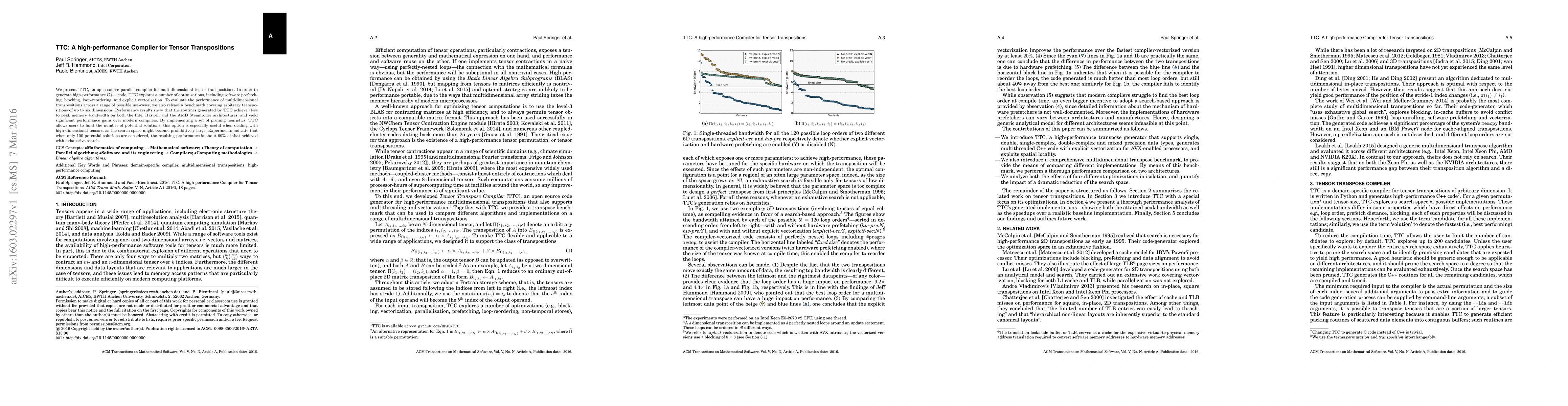 TTC is a parallel compiler for optimizing multidimensional tensor transpositions, achieving near-peak memory bandwidth on both Intel and AMD architectures. It employs various optimizations and allows users to limit potential solutions with pruning heuristics, maintaining 99% performance with only 100 considered solutions.