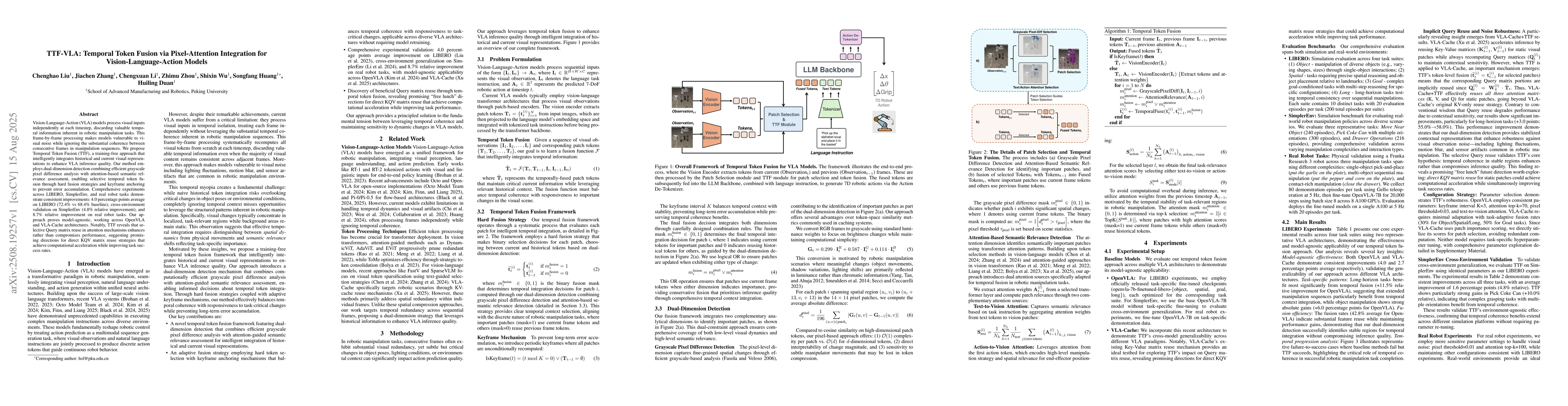 Vision-Language-Action (VLA) models process visual inputs independently at each timestep, discarding valuable temporal information inherent in robotic manipulation tasks. This frame-by-frame processing makes models vulnerable to visual noise while ignoring the substantial coherence between consecutive frames in manipulation sequences. We propose Temporal Token Fusion (TTF), a training-free approach that intelligently integrates historical and current visual representations to enhance VLA inference quality. Our method employs dual-dimension detection combining efficient grayscale pixel difference analysis with attention-based semantic relevance assessment, enabling selective temporal token fusion through hard fusion strategies and keyframe anchoring to prevent error accumulation. Comprehensive experiments across LIBERO, SimplerEnv, and real robot tasks demonstrate consistent improvements: 4.0 percentage points average on LIBERO (72.4\% vs 68.4\% baseline), cross-environment validation on SimplerEnv (4.8\% relative improvement), and 8.7\% relative improvement on real robot tasks. Our approach proves model-agnostic, working across OpenVLA and VLA-Cache architectures. Notably, TTF reveals that selective Query matrix reuse in attention mechanisms enhances rather than compromises performance, suggesting promising directions for direct KQV matrix reuse strategies that achieve computational acceleration while improving task success rates.