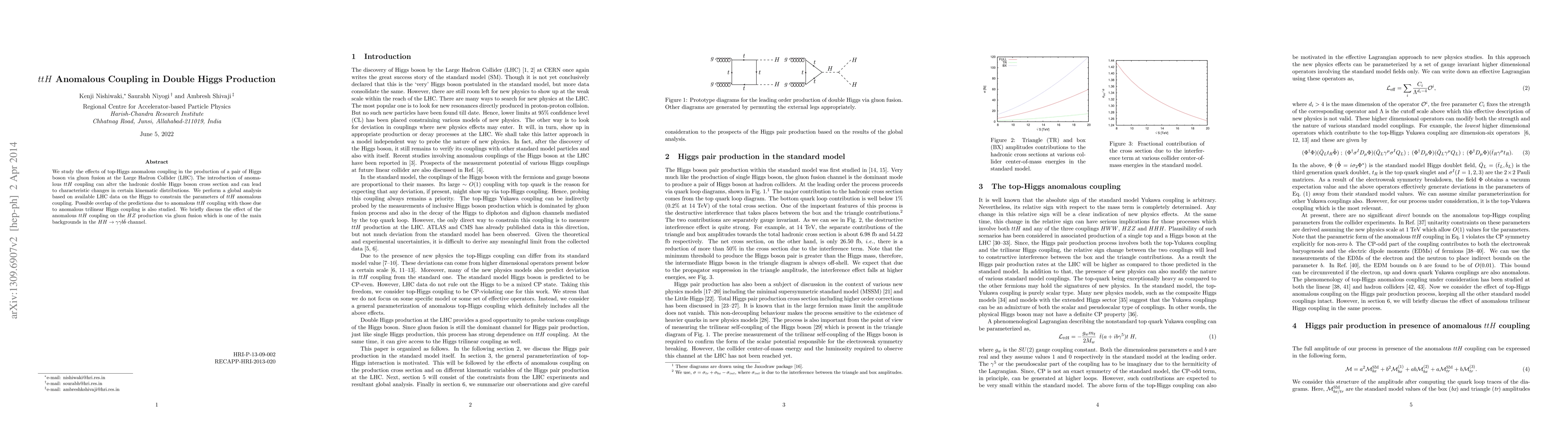 We study the effects of top-Higgs anomalous coupling in the production of a pair of Higgs boson via gluon fusion at the Large Hadron Collider (LHC). The introduction of anomalous $ttH$ coupling can alter the hadronic double Higgs boson cross section and can lead to characteristic changes in certain kinematic distributions. We perform a global analysis based on available LHC data on the Higgs to constrain the parameters of $ttH$ anomalous coupling. Possible overlap of the predictions due to anomalous $ttH$ coupling with those due to anomalous trilinear Higgs coupling is also studied. We briefly discuss the effect of the anomalous $ttH$ coupling on the $HZ$ production via gluon fusion which is one of the main backgrounds in the $HH \to \gamma\gamma b {\bar b}$ channel.