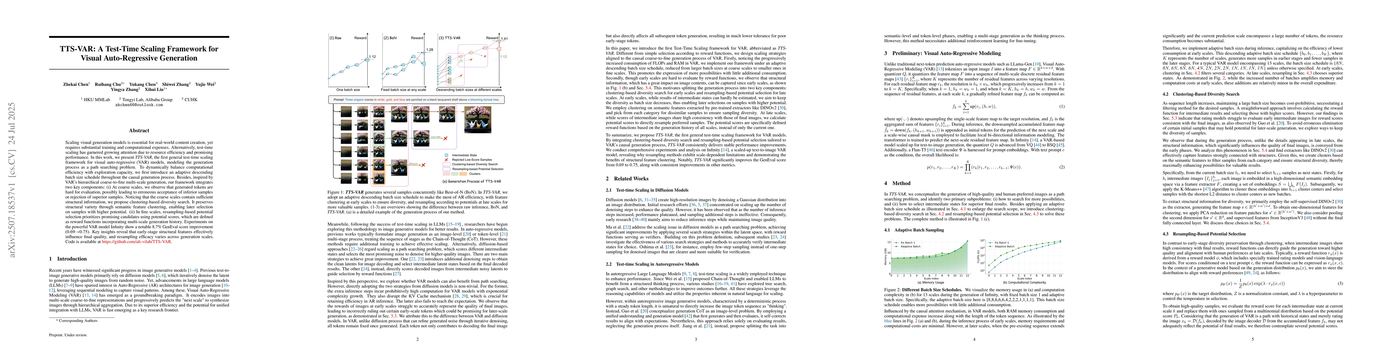 Scaling visual generation models is essential for real-world content creation, yet requires substantial training and computational expenses. Alternatively, test-time scaling has garnered growing attention due to resource efficiency and promising performance. In this work, we present TTS-VAR, the first general test-time scaling framework for visual auto-regressive (VAR) models, modeling the generation process as a path searching problem. To dynamically balance computational efficiency with exploration capacity, we first introduce an adaptive descending batch size schedule throughout the causal generation process. Besides, inspired by VAR's hierarchical coarse-to-fine multi-scale generation, our framework integrates two key components: (i) At coarse scales, we observe that generated tokens are hard for evaluation, possibly leading to erroneous acceptance of inferior samples or rejection of superior samples. Noticing that the coarse scales contain sufficient structural information, we propose clustering-based diversity search. It preserves structural variety through semantic feature clustering, enabling later selection on samples with higher potential. (ii) In fine scales, resampling-based potential selection prioritizes promising candidates using potential scores, which are defined as reward functions incorporating multi-scale generation history. Experiments on the powerful VAR model Infinity show a notable 8.7% GenEval score improvement (from 0.69 to 0.75). Key insights reveal that early-stage structural features effectively influence final quality, and resampling efficacy varies across generation scales. Code is available at https://github.com/ali-vilab/TTS-VAR.