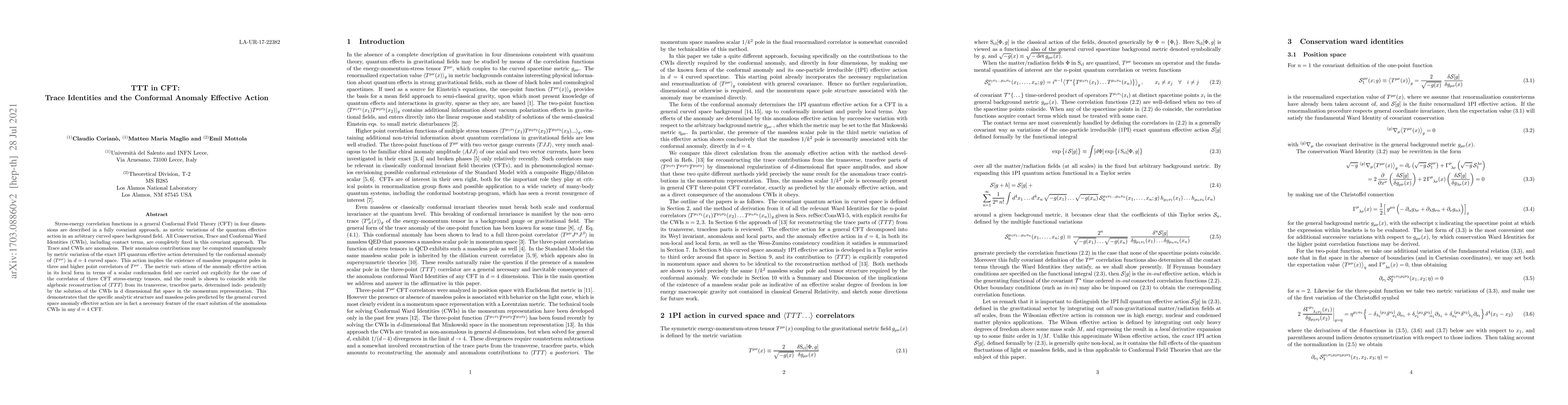 Stress-energy correlation functions in a general Conformal Field Theory (CFT) in four dimensions are described in a fully covariant approach, as metric variations of the quantum effective action in an arbitrary curved space background field. All Conservation, Trace and Conformal Ward Identities (CWIs), including contact terms, are completely fixed in this covariant approach. The Trace and CWIs are anomalous. Their anomalous contributions may be computed unambiguously by metric variation of the exact 1PI quantum effective action determined by the conformal anomaly of $\left\langle T^{\mu\nu}\right\rangle$ in $d = 4$ curved space. This action implies the existence of massless propagator poles in three and higher point correlators of $T^{\mu\nu}$ . The metric variations of the anomaly effective action in its local form in terms of a scalar conformalon field are carried out explicitly for the case of the correlator of three CFT stress-energy tensors, and the result is shown to coincide with the algebraic reconstruction of $\left\langle TTT\right\rangle$ from its transverse, tracefree parts, determined independently by the solution of the CWIs in d dimensional flat space in the momentum representation. This demonstrates that the specific analytic structure and massless poles predicted by the general curved space anomaly effective action are in fact a necessary feature of the exact solution of the anomalous CWIs in any $d = 4$ CFT.